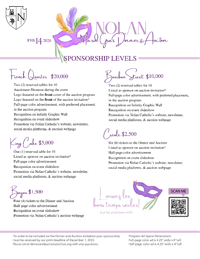 The festive spirit is coming back to Nolan Catholic! Join us for our Mardi Gras Dinner & Auction on Saturday, February 14, at the Hurst Conference Center. Expect a wonderful evening full of great food, surprises, and community celebration — all to support our students and the mission of Nolan Catholic.