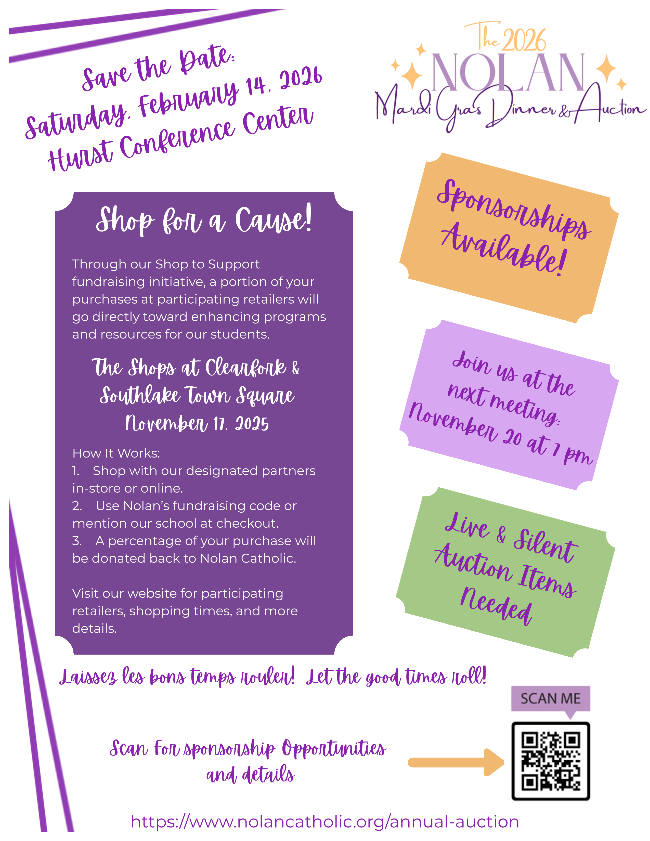 Thank you for your continued support of Nolan Catholic High School. Together, we can make a meaningful difference—one purchase at a time.