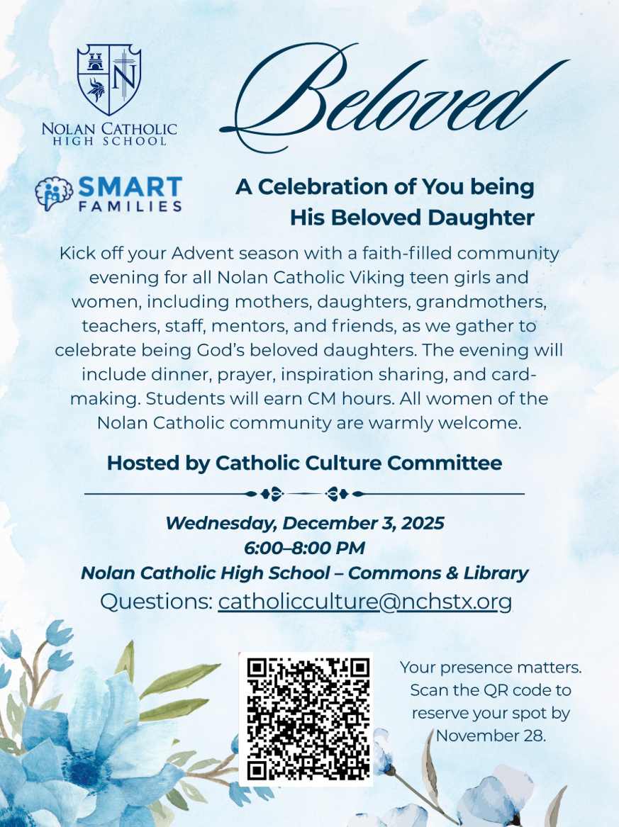Kick off your Advent season with a faith-filled community evening for all Nolan Catholic Viking teen girls and women, including mothers, daughters, grandmothers, teachers, staff, mentors, and friends, as we gather to celebrate God's beloved daughters.