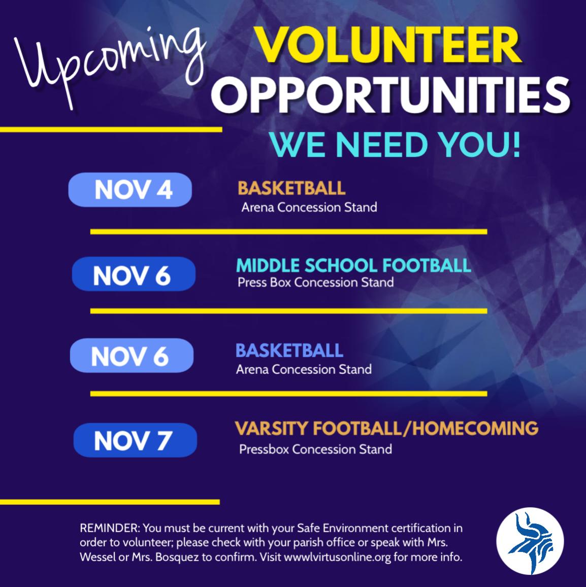 The Viking Club is gearing up for a big Homecoming week, and we need volunteers to help with concession sales, especially at Friday’s game, our last home football game of the season! We will be in the press box and also at the field level, and it’s sure to be a fun and busy night. Please check the Signup Genius for open volunteer slots and fill in where you can. Middle school and high school students may accompany their parent or approved adult supervisor and work to earn service hours. Be sure you are current with your Safe Environment certification before volunteering. Thank you for your support!