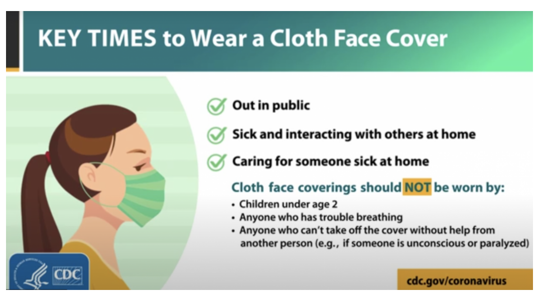 - Wear a cloth face covering that covers your nose and mouth in public settings.