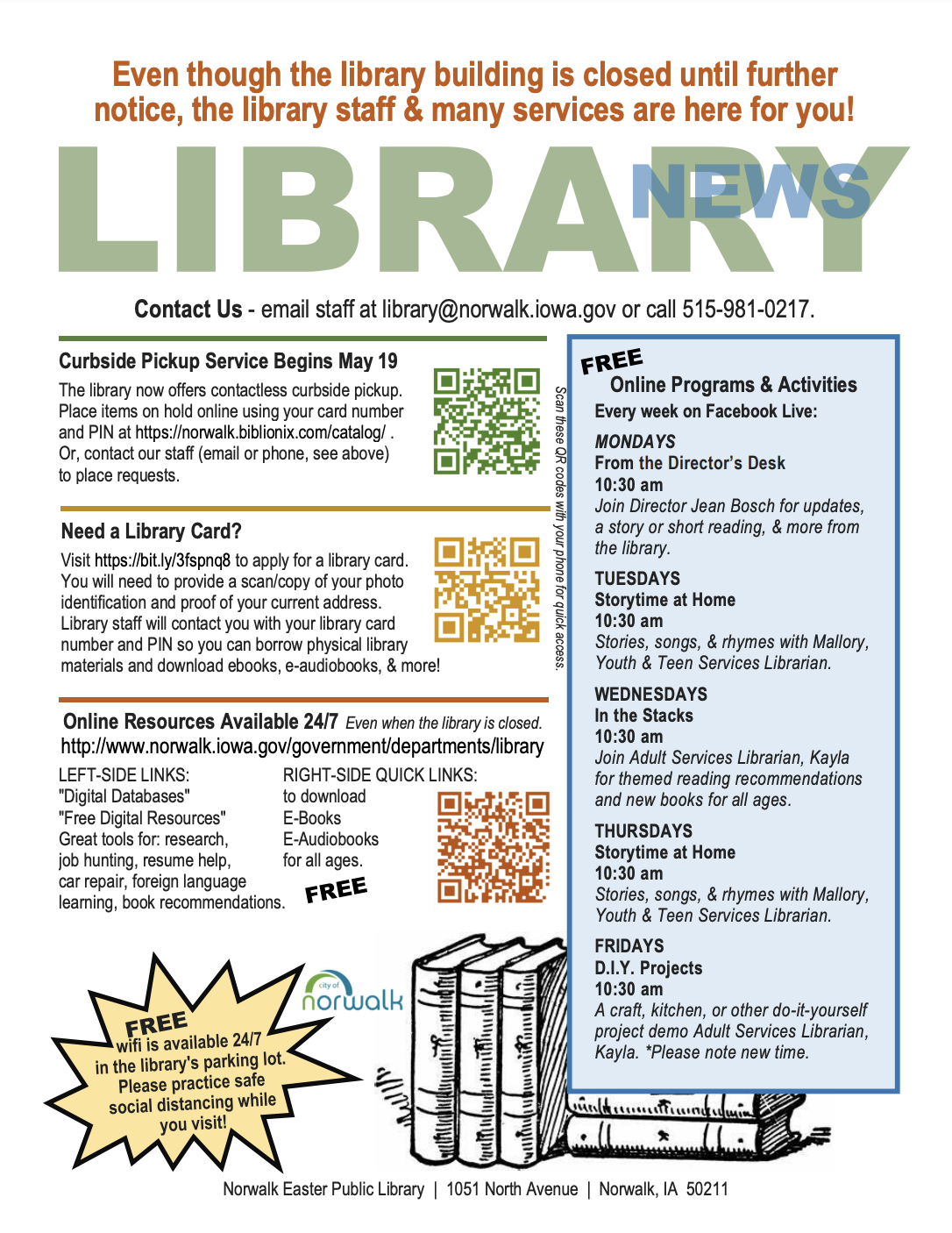 The Norwalk Community School District is offering free wifi availability for school Chromebooks only, in the NHS west parking lot, stadium, and Middle School parking lot. Wifi access is also available in the McAninch parking lot, the Norwalk Easter Public Library parking lot, Billy O. Phillips Park, and the public swimming pool.