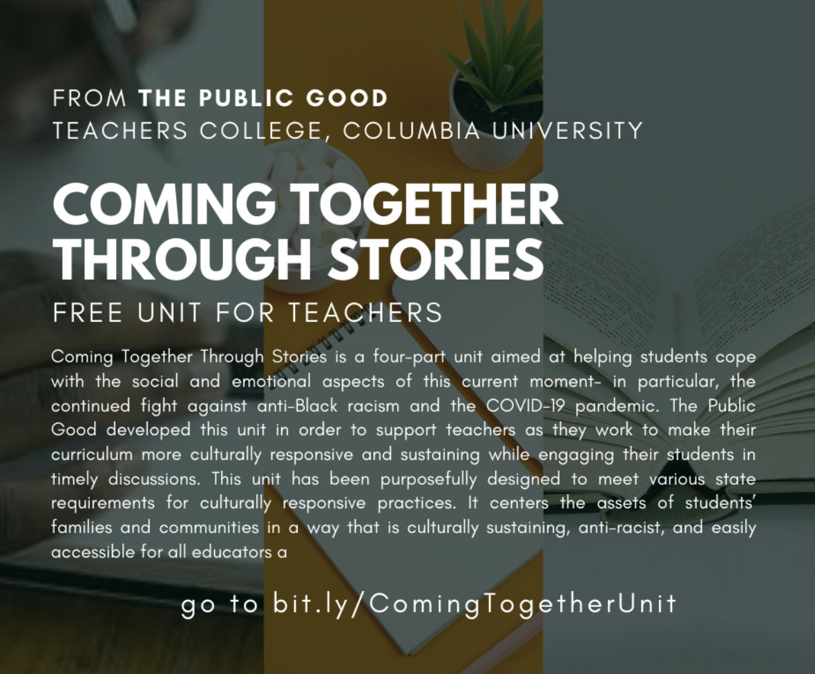 The Public Good has created a free unit for teachers: "Coming Together Through Stories" is meant to help teachers learn to better help students cope with the social and emotional aspects of this current moment. Learn more here.