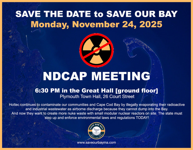Remember, the entire Cape, along with Plymouth, Duxbury, and Scituate, overwhelmingly voted for our state government to halt radioactive airborne pollution evaporation this past spring. Those results were delivered to Governor Healey. The state should be enforcing environmental laws that prohibit airborne radioactive pollution TODAY. [See analysis by Pilgrim Watch here.]