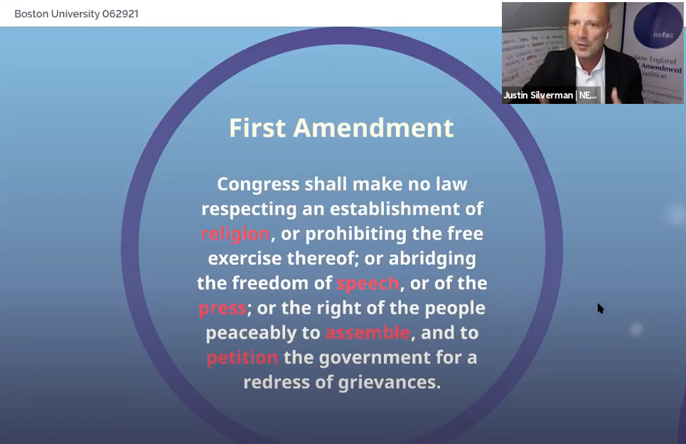 Justin Silverman, NEFAC's executive director, recently led presentations for high school journalism students from throughout the region. In separate classes, Silverman discussed open government and First Amendment law with students attending the annual New England High School Journalism Collaborative conference and the Boston University Summer Journalism Academy.