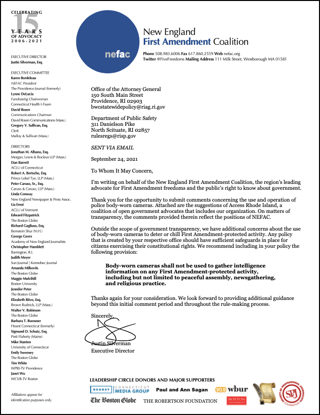 “We start from the position that the use of body-worn cameras is a welcome measure for holding police officers and police departments accountable as they exercise the police powers of the state,” wrote NEFAC and other members of Access/RI in a Sept. 23 letter to the Office of the Attorney General. [...]