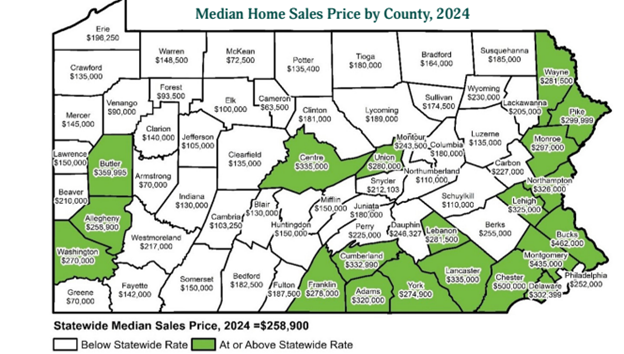 This map produced by the Center for Rural Pennsylvania shows the median home sale price by county in 2024. In our region, Pike County had the highest median home sale price in 2024 at $299,999 while Schuylkill County had the lowest median home sale price in 2024 at $110,000.