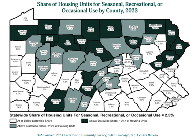 The Pocono region of Northeastern Pennsylvania has the highest concentration of seasonal housing units in the Commonwealth. This statistic looks at housing units that are used as vacation homes, short term rentals, hunting cabins, and other types of dwellings sperate from the owner’s primary residence. Approximately 1/3 of homes in Pike and Wayne Counties are used for this purpose. Carbon and Monroe Counties also have a sizable percentage of their housing stock in this category. Meanwhile, Lackawanna, Luzerne, and Schuylkill Counties are below the statewide average of homes that are seasonal use. This map from the Center for Rural Pennsylvania shows the percentage of homes in each county that are seasonal.