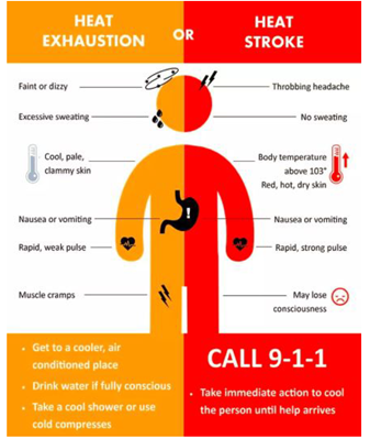 With summer fast approaching, we have already seen several days at 90⁰ and above. However, it does not have to be a heat wave to experience these conditions. Please be aware of the warning signs below and take appropriate actions.
