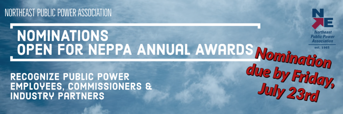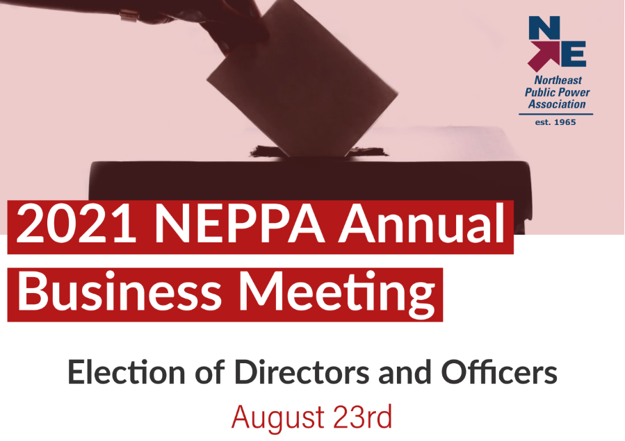 The Northeast Public Power Association will be holding elections to the Board at our 2021 NEPPA Annual Business Meeting on Monday, August 23, 2021 (3:45 pm) at The Westin Portland Harborview Hotel, anyone interested in seeking a nomination to the NEPPA Board you should reach out to the Executive Director, Bonnie Biocchi or the Chair of the Nominating Committee Michael Cloutier.