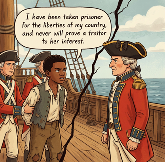 “Yeah! You’re right, Abraham! Time is changing!” Hope exclaimed worriedly. “If James at 10-years-old doesn’t hear the reading today, he won’t be considered one of America’s ‘Black Founders’! When he’s 15, he won’t fight against the British on the side of America in the American Revolutionary War. James is supposed to believe in the cause of American independence so much that he even has his freedom taken away for 8 months by the British after declaring ‘I have been taken prisoner for the liberties of my country, and never will prove a traitor to her interest.’! We ain’t got no time to waste!”