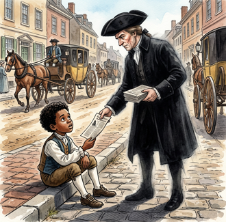 But a 10-year-old James Fortune didn’t seem to notice the strange appearance. His mind was on something else. Usually curious, right now he had no curiosity. The man had handed him a pamphlet. It stated no children were allowed at the State House Yard to hear the Declaration of Independence be read. “There’s no children allowed?” He could feel his heart sink. What was the point of his mother encouraging his book-learning when he had to read such words? James sulked- he was so looking forward to hearing the founding document of their new nation. Almost as much as he wanted to work in the ship yard and be like his father. After his father died two years ago, his mother insisted he go to school to learn to read, write, and do math. From James’ perspective, his father had been educated, but worked mainly with his skills as a sail maker- so why did James have to go to school? A few blocks from his house is where the Second Continental Congress met and drafted the Declaration- and he was barred from hearing it? Is it because he was a Negro, of African descent, even though he was free? Was it just because he was a child? At least hearing the document, maybe he could be useful. Lost in his thoughts, James didn’t even notice the strange man disappear into a horse-drawn carriage with a rather pleased smile forming over the ugly scar.