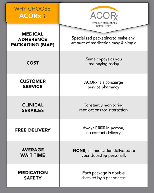 ACORx Pharmacy manages patients' medications to make life simple. They package and deliver medications monthly to keep individuals healthy at home. For additional information call 412-857-2922.