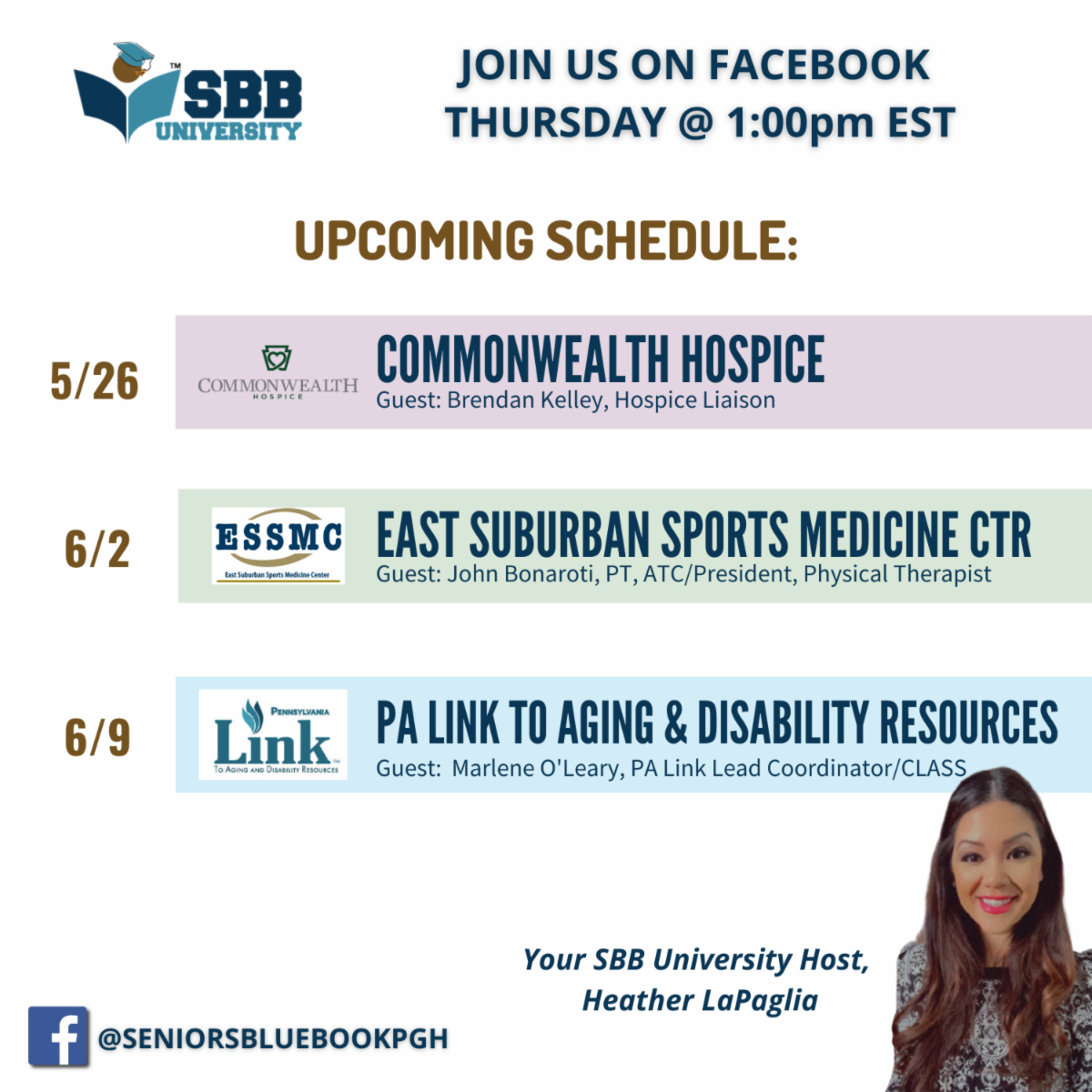 SBB University welcomes Maureen Sirianni, Director of Marketing from Country Meadows of South Hills! Country Meadows of South Hills campus in Bridgeville specializes in Independent Living, Personal Care, Memory Care and their NEW Progressions/Restoration Program (which provides short-term & rehabilitation for up to 8 weeks, for those who are not quite ready to go back home). Call 412-257-4566 or visit www.CountryMeadows.com to learn more.