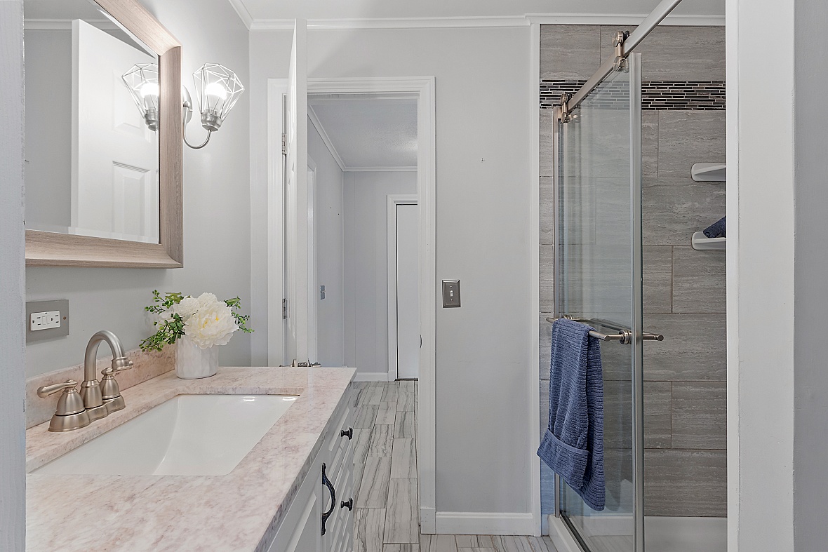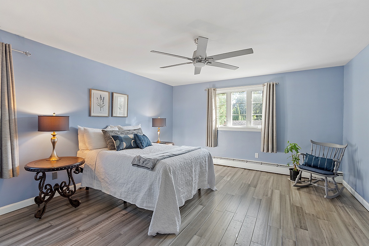The main bedroom on one end of the home connects to an updated full bath with a walk-in shower, and two more bedrooms and a second full bath are nicely separated on the other end of the house.