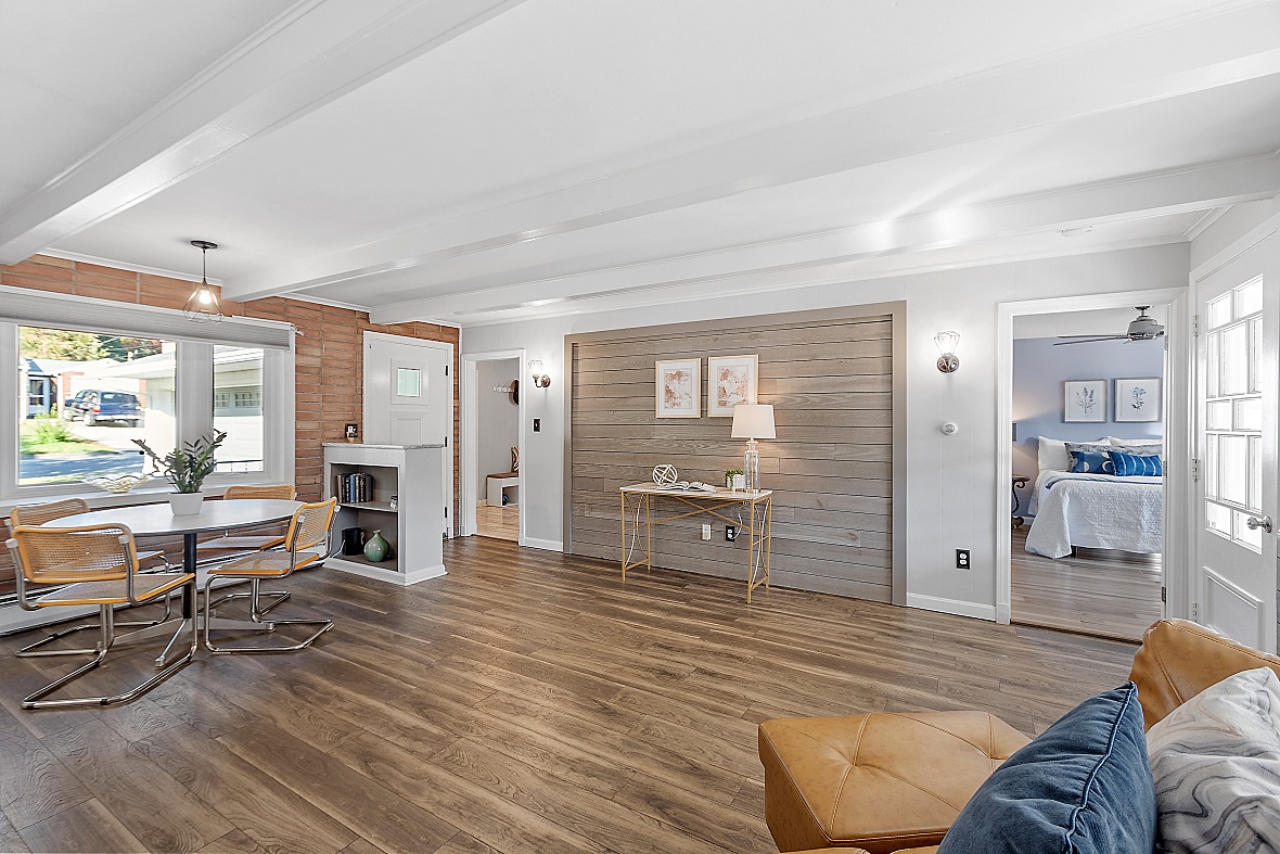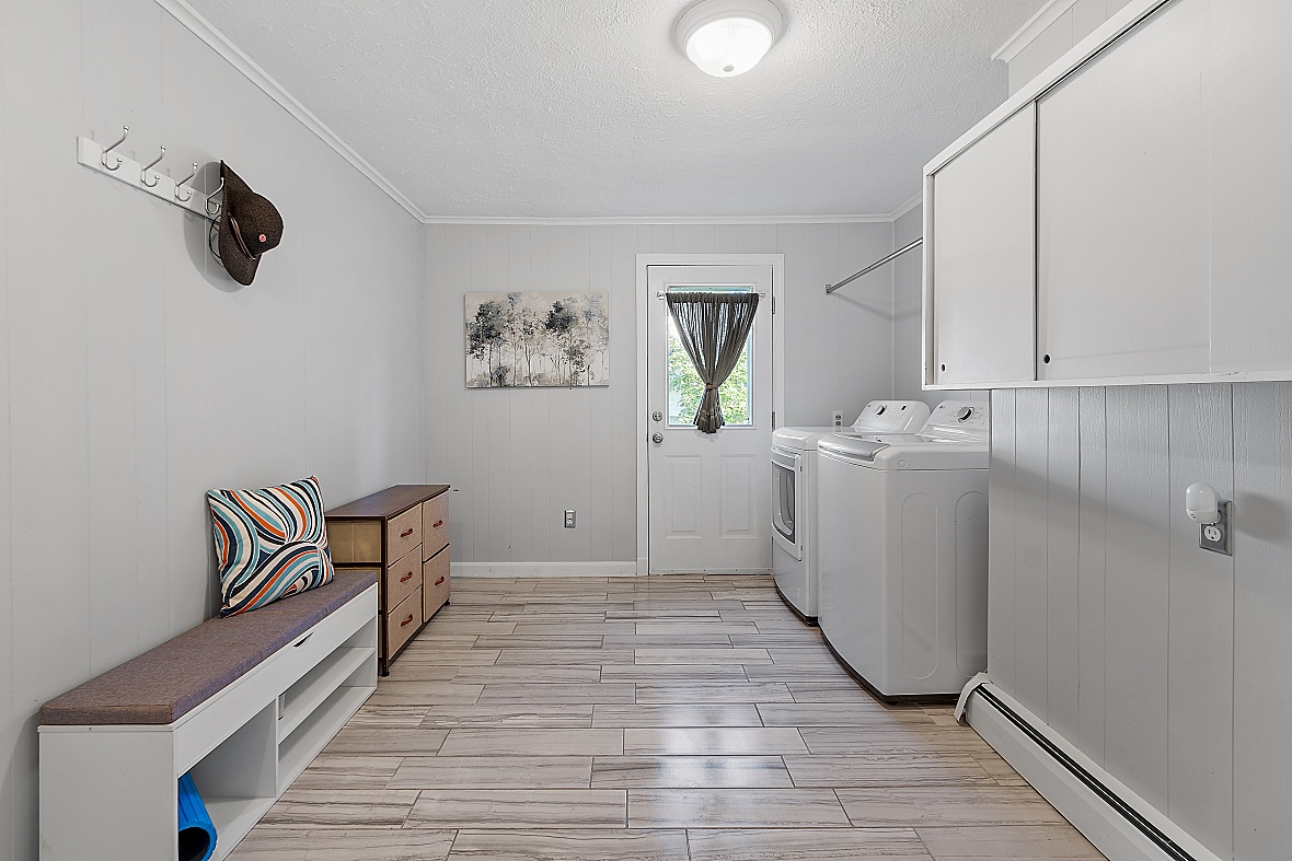 Refinished hardwood flooring in the living room and bedrooms. Two car garage with a new door leads to a mudroom and laundry area.