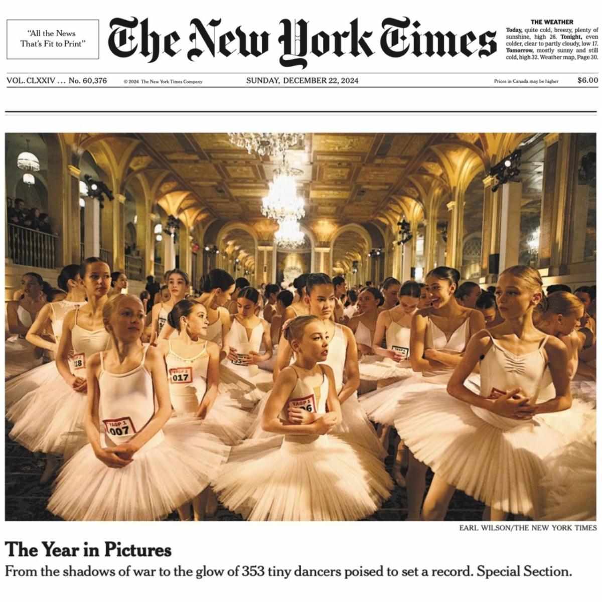 YAGP was featured on the cover of the The New York Times as part of “The Year in Pictures 2024” with a photo from one of the most memorable moments this year: YAGP Finalists setting a new Guinness World Record for the most dancers en pointe simultaneously. 353 young dancers from around the world gathered at the iconic Plaza Hotel in Manhattan during the YAGP 25th Anniversary Finals for this exciting historical moment. Click here to see the magic and hear more from the dancers themselves. | | |