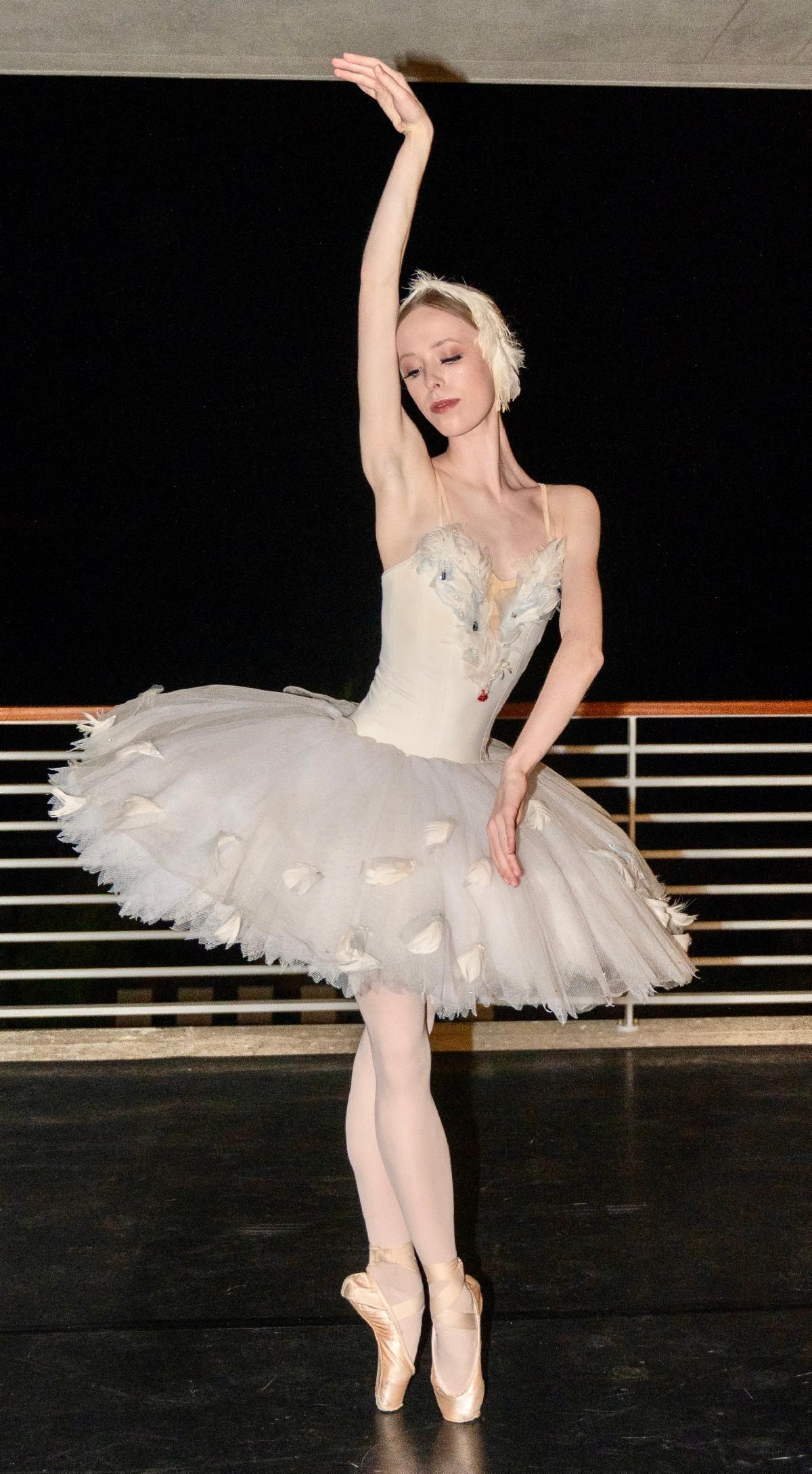 The intimate gathering featured a moving sunset performance of The Dying Swan by YAGP alumna Elisabeth Beyer of American Ballet Theatre (pictured), along with a performance by YAGP scholarship recipient Macie Miersch of The Sarasota Ballet’s Margaret Barbieri Conservatory, demonstrating YAGP’s impact on a young artist’s journey from student to professional dancer.
