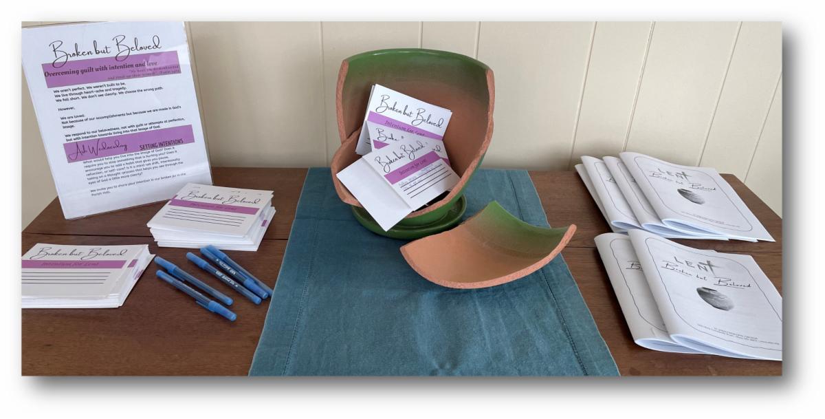 Currently, in our solarium there is a piece of broken pottery, in which we invite you to write your intentions on a card and place them in this vessel. There are also journals, conveniently 40 pages long, that will provide an opportunity for you to record your thoughts and feelings about your intentions, as well as your beloved nature as one of God’s Beloved. As you journey through Lent, be mindful of your intentions AND that you are beloved by God. We are all Broken but Beloved.