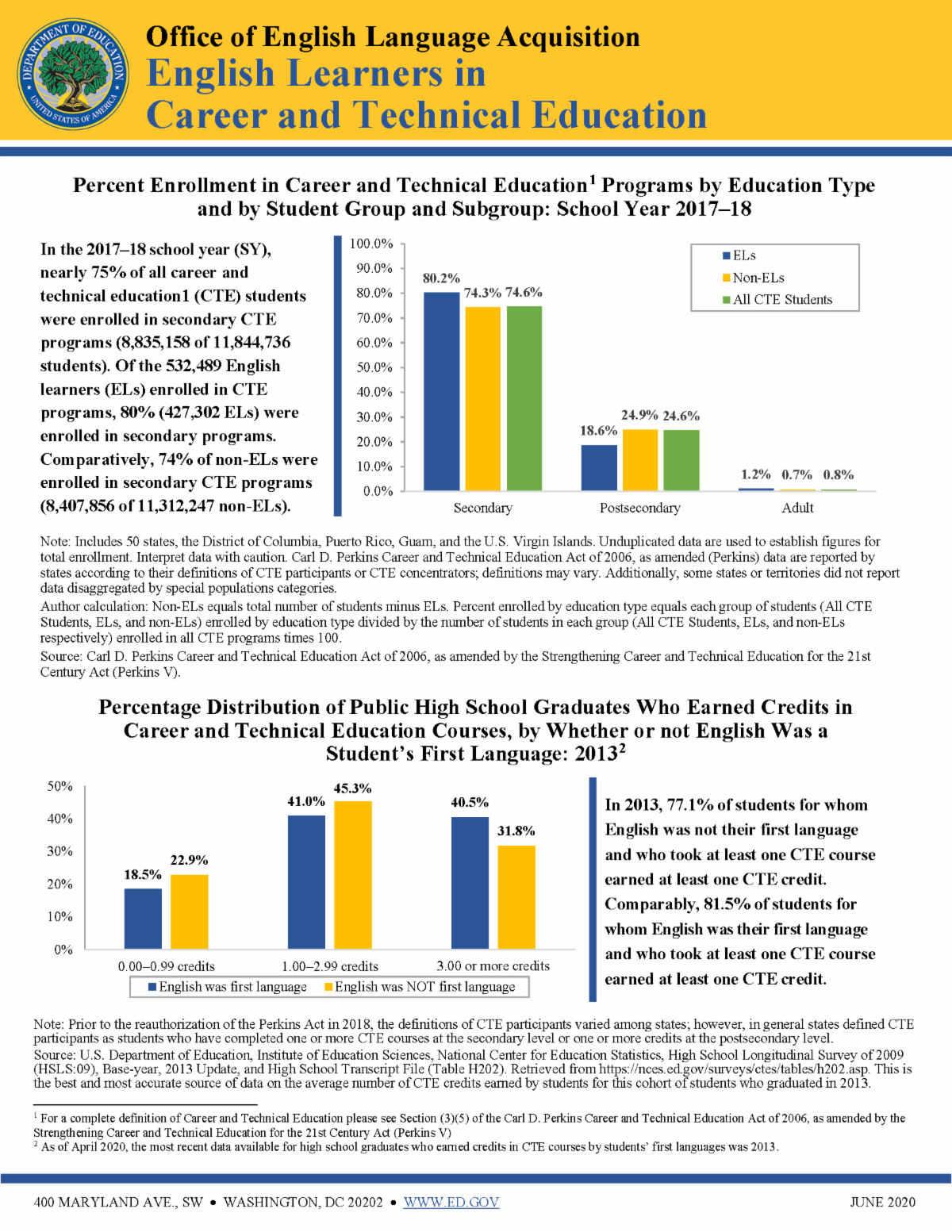 - In the 2017–18 school year, 532,489 ELs were enrolled in CTE programs. Of the students in this group, 80% were also enrolled in secondary CTE programs.