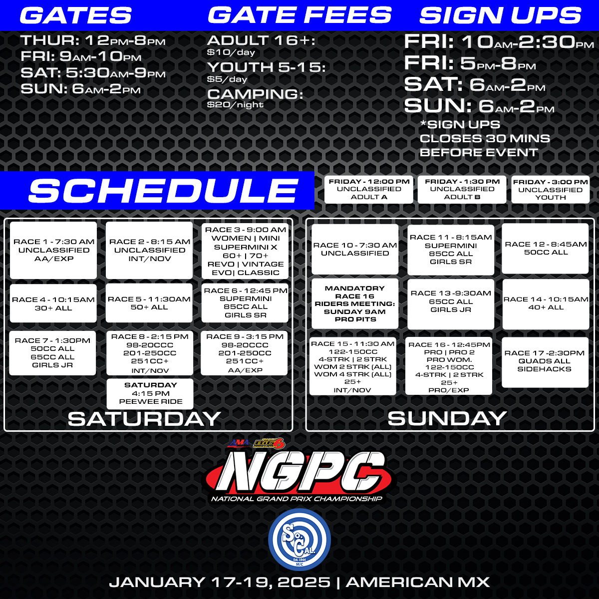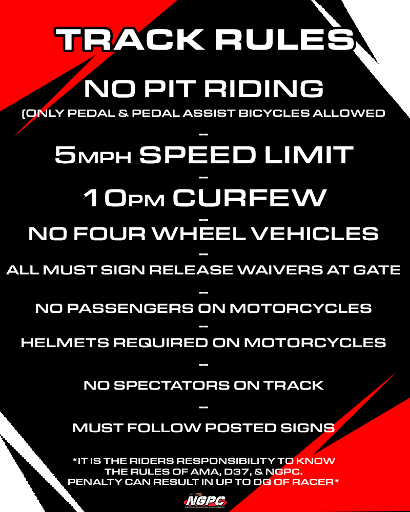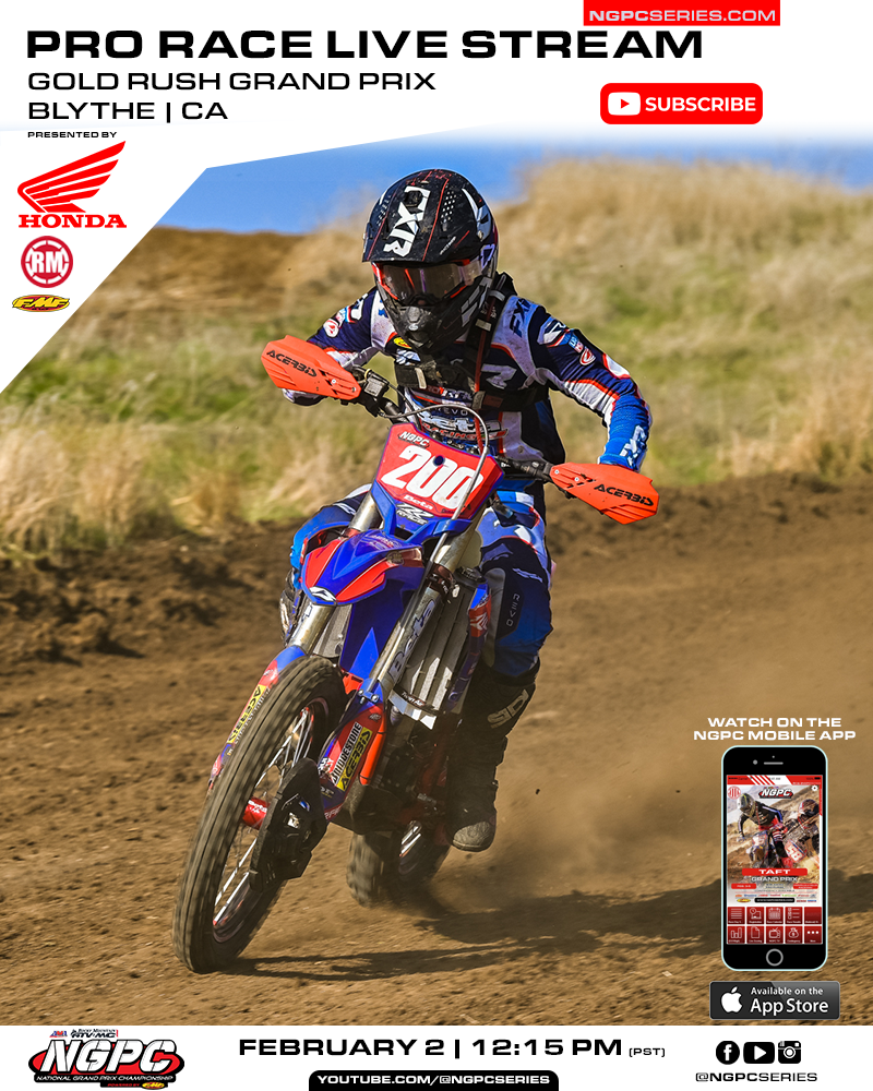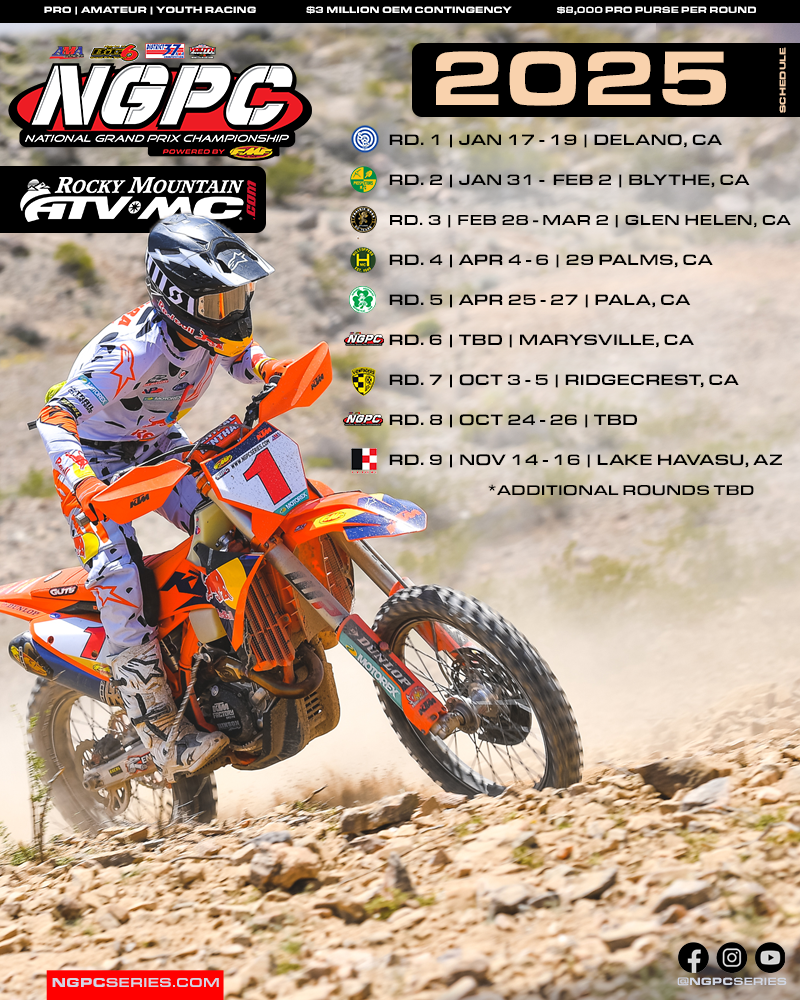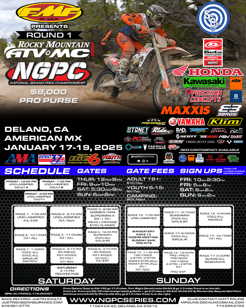 The National Grand Prix Championship (NGPC), formerly known as the Big6 GP Series, is the West Coast's premier off-road racing series. Founded in 1995, six original AMA District 37 clubs formed a regional grand prix series that instantly became a hit amongst SoCal locals. It has since morphed into the now 10-round AMA National Championship, produced by those same six AMA District 37 clubs, along with two others. Grand Prix racing has quickly grown into one of the most popular forms of off-road racing for both amateur and pro racers alike. The appealing GP races give riders plenty of seat time throughout the weekend and offers a wide variety of terrain and race tracks throughout the year. NGPC is home to some of the fastest Pro riders in the world while also promoting the grassroots racing that we've all come to enjoy.