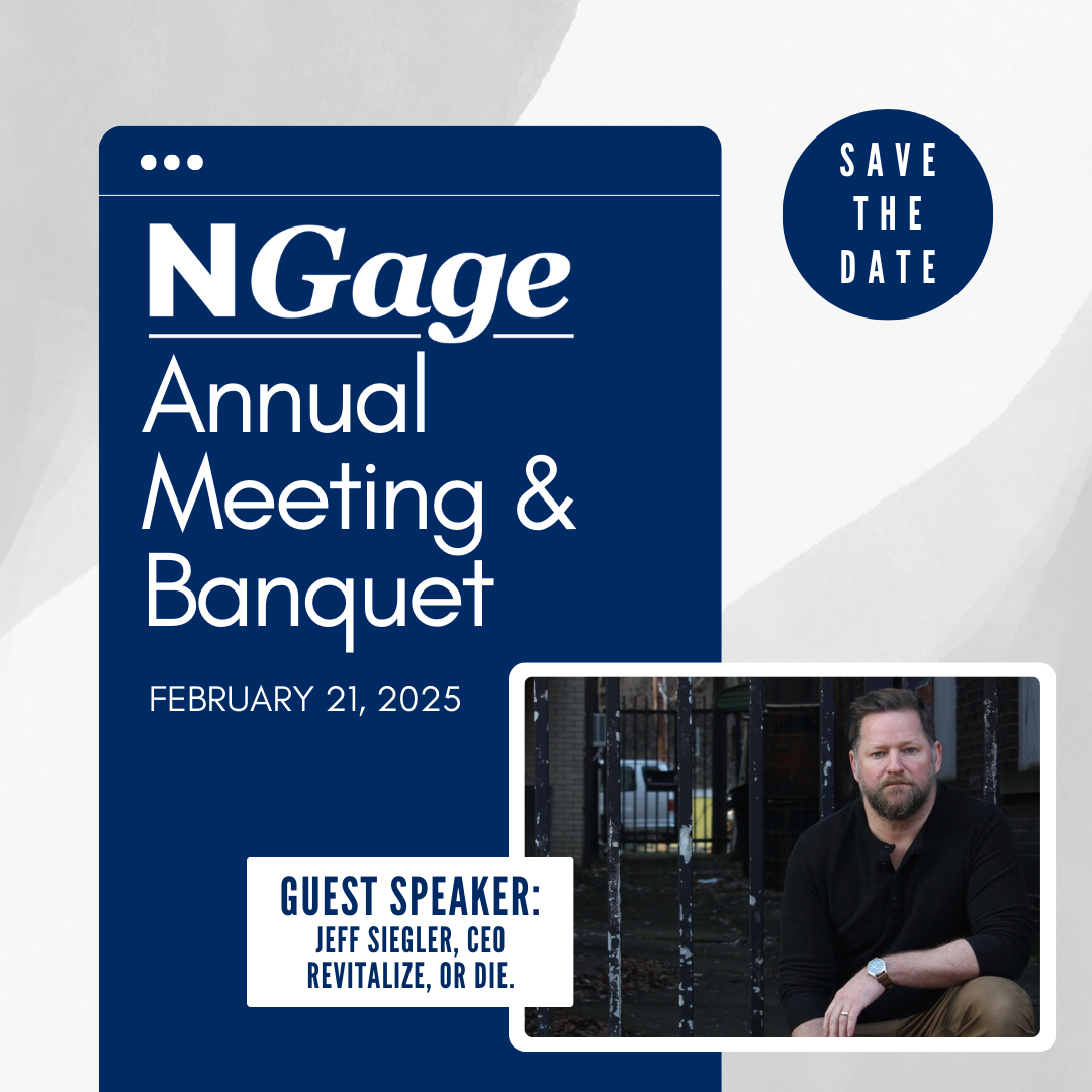 NGage hosted its Annual Meeting & Banquet in February, where the membership met and elected board candidates, heard an exclusive update from executive director, Rachel Kreikemeier, and enjoyed a meal from the 1917 Club. Jeff Siegler, of Revitalize, or Die, was the guest speaker this year and gave a humorous talk about civic pride and apathy. Check out Jeff's Facebook post wrapping up his travels at the end of February, including to our area. While you're there, be sure to give his page a like and follow!