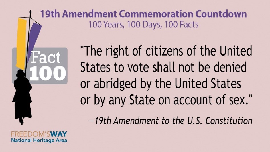 May 19th marked 100 days until the centennial of the 19th Amendment. To commemorate the arrival of the historic event, Freedom's Way National Heritage Area is counting down each of the days until the 19th Amendment's anniversary, August 26th, by sharing one fact about suffrage history. These snippets of history will share the story of suffrage from Freedom's Way NHA's communities in New Hampshire and Massachusetts, as well as from the nation as a whole. Follow them on Facebook, Twitter, and Instagram to see 19th amendment facts each day.