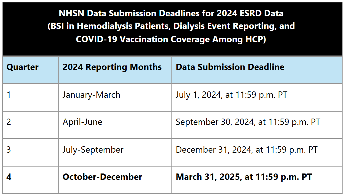Outpatient hemodialysis facilities participating in the Centers for Medicare & Medicaid Services (CMS) End-Stage Renal Disease Quality Incentive Program (ESRD QIP) must submit their Quarter 4 2024 National Healthcare Safety Network (NHSN) data by Monday, March 31, 2025, at 11:59 p.m. Pacific Time (PT). Quarter 4 2024 data covers data from October 1, 2024, through December 31, 2024, for the following ESRD QIP measures: