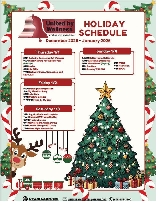 Speaking of support groups and connection, here's a quick reminder: United By Wellness, a program of MHANJ that we LOVE to share every chance we get, will be hosting peer support groups from January 1–4. If you’re looking for extra support as the holidays come to a close, or if you just need some good company, consider attending these sessions as they are a great way to reflect, share, and be part of a community. Attending these virtual groups is free! Just make sure to register.