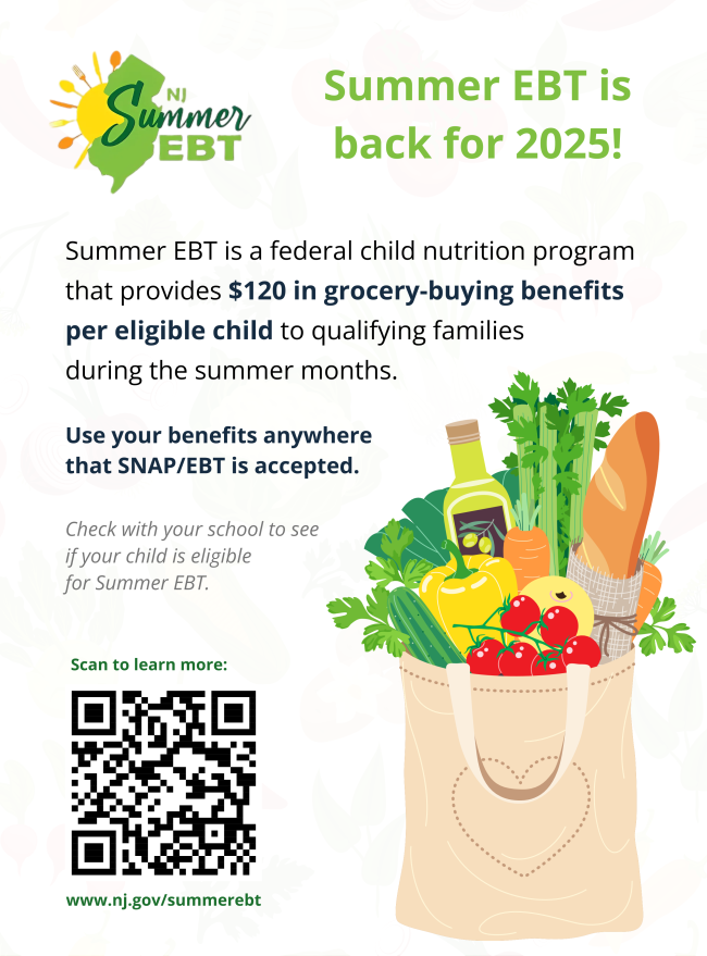 We’re excited to announce that the NJ Summer SNAP EBT Program is back for 2025! New Jersey is once again participating in this valuable program, which provides food benefits to low-income families with school-age children during the summer months. The benefit will total $120 per child per summer.