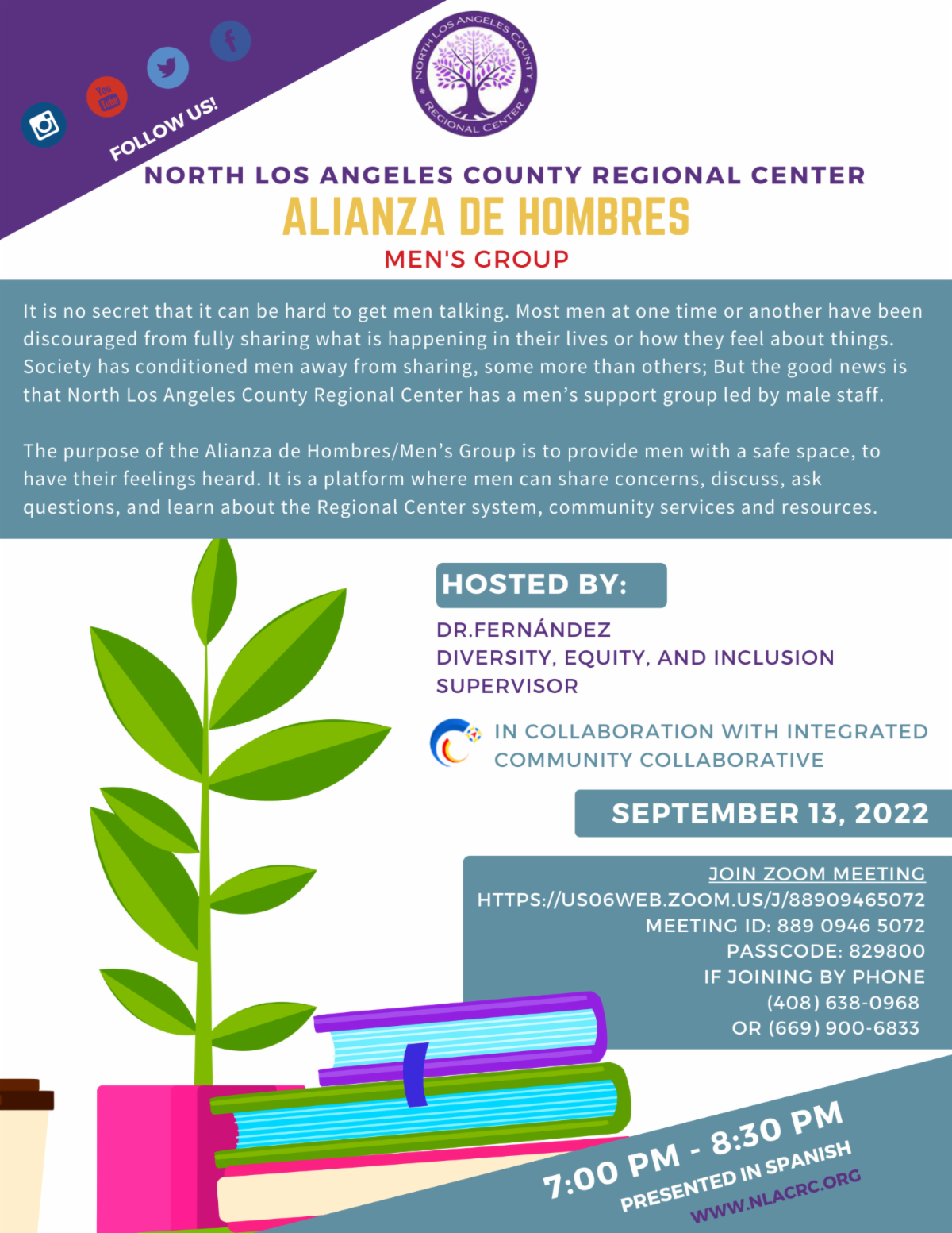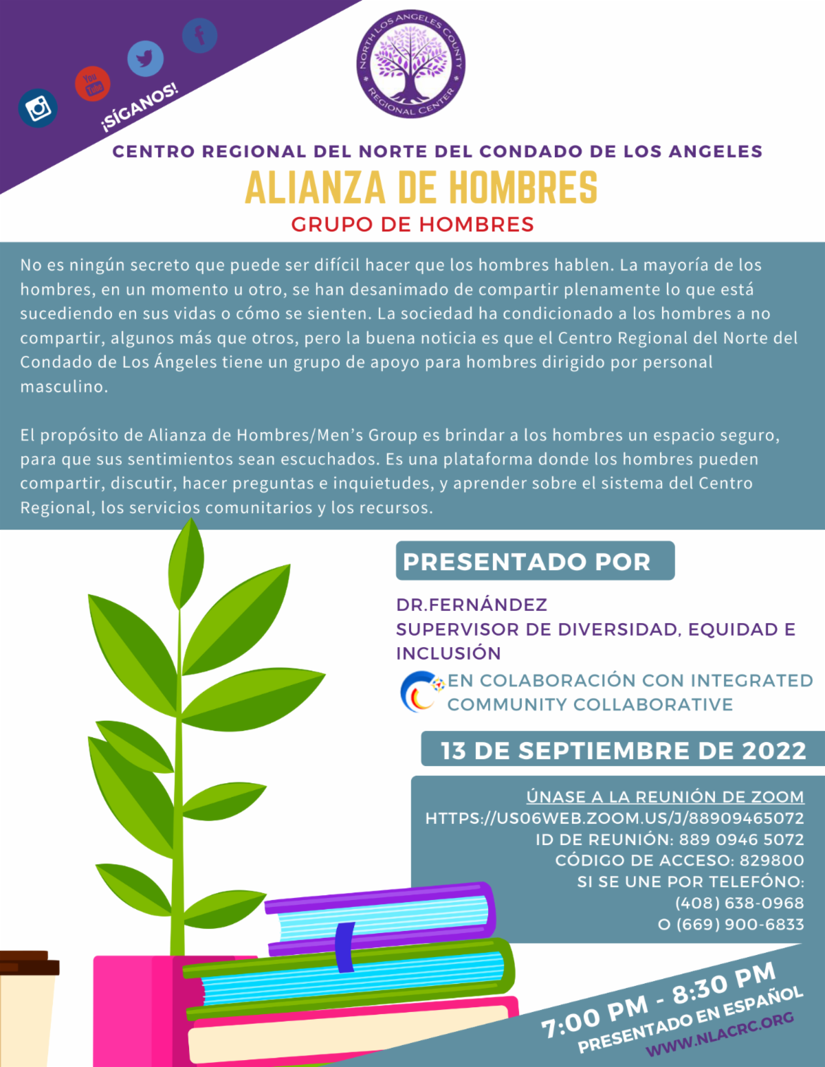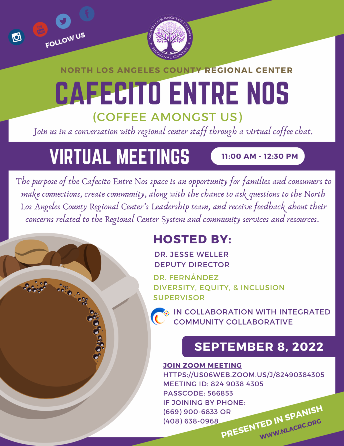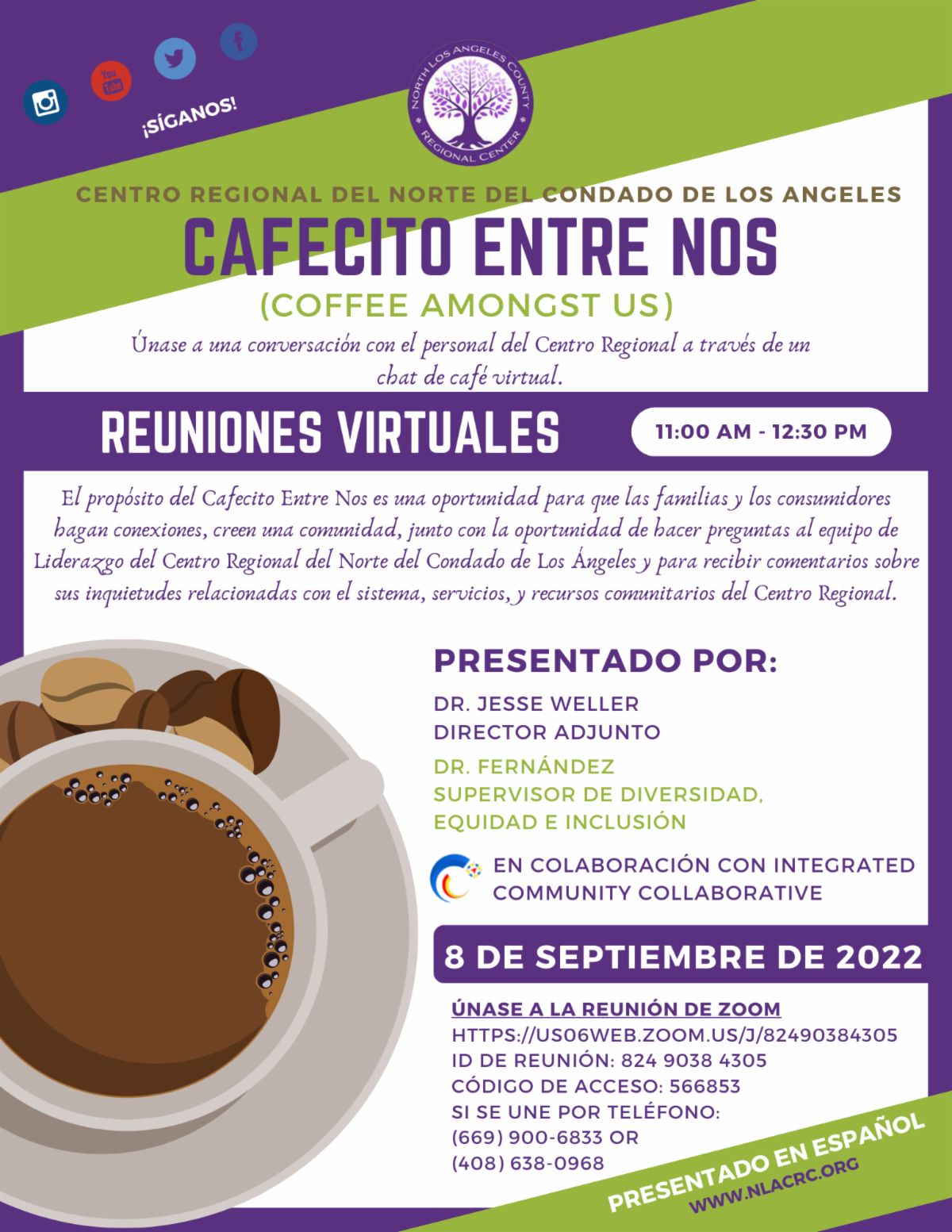 The purpose of the Cafecito Entre Nos space is an opportunity for families and consumers to make connections, create community, along with the chance to ask questions to the North Los Angeles County Regional Center’s Leadership team, and receive feedback about their concerns related to the Regional Center System and community services and resources.