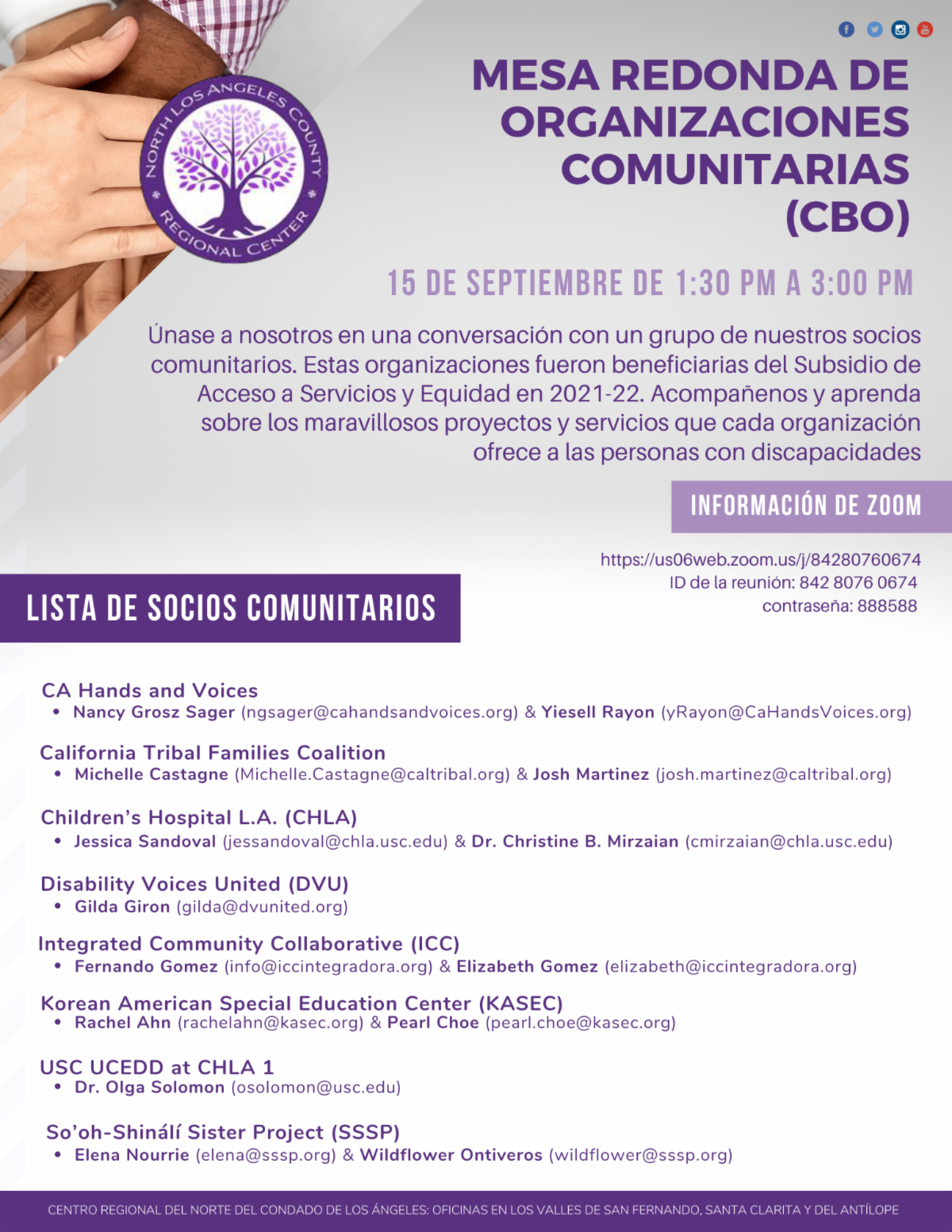 padres y familias del NLACRC pueden ayudarle si tiene preguntas o si necesita ayuda con los servicios del centro regional. Comuníquese con ellos a su conveniencia.