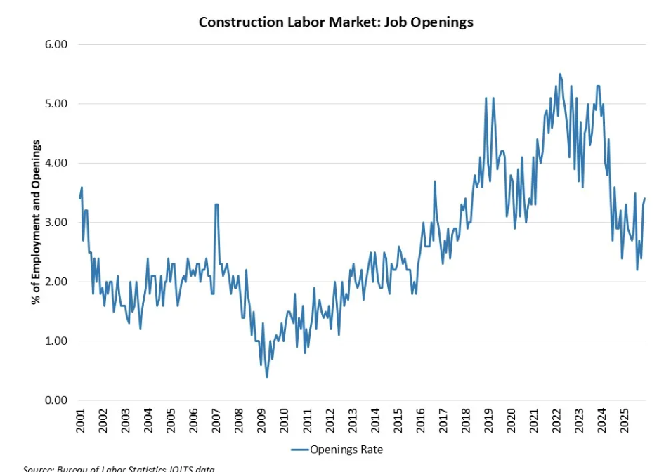 The construction job openings rate increased to 3.4% in December, higher than the 3.2% rate estimated a year ago.The layoff rate in construction declined to 1.5% in December. The quits increased to 1.5% for the month.