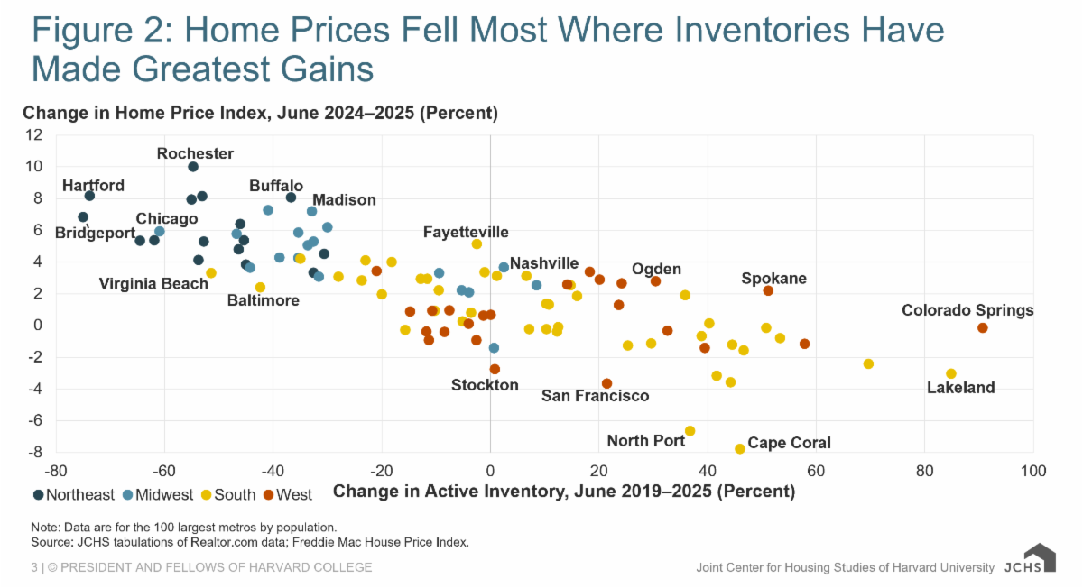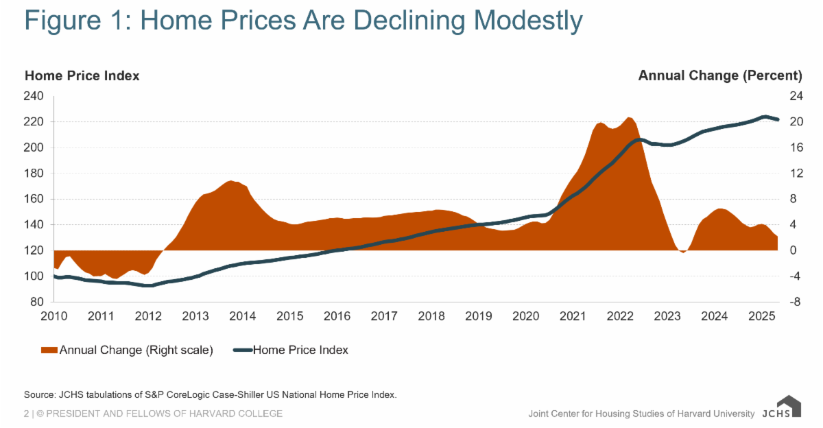 The persistent affordability pressures and high interest rates, national home prices rose modestly through early 2025 before beginning to ease, with annual growth slowing to 2.2 percent in May and monthly declines for three consecutive months. Rising for-sale inventories have driven price declines in many Southern and Western markets—particularly Sunbelt metros like Cape Coral and several large Florida markets—while prices continue to climb where for-sale supply remains tight, especially across the Northeast and Midwest. Even as some markets cool, national prices are still about 57 percent higher than in 2019.
