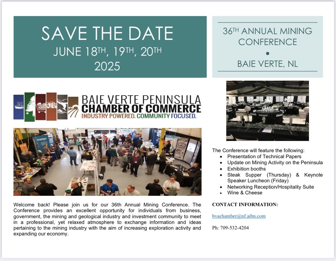 36th Annual Mining Conference, Baie Verte Peninsula Chamber of Commerce, June 18-20, 2025, Bair Verte, NL, In-person.