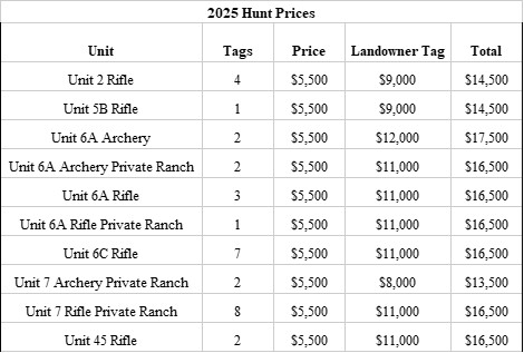 Hunts include meals, lodging and a guaranteed access to purchase your State license/tag, so no draws to contend with. Tax of approx. 5.125% is extra.
