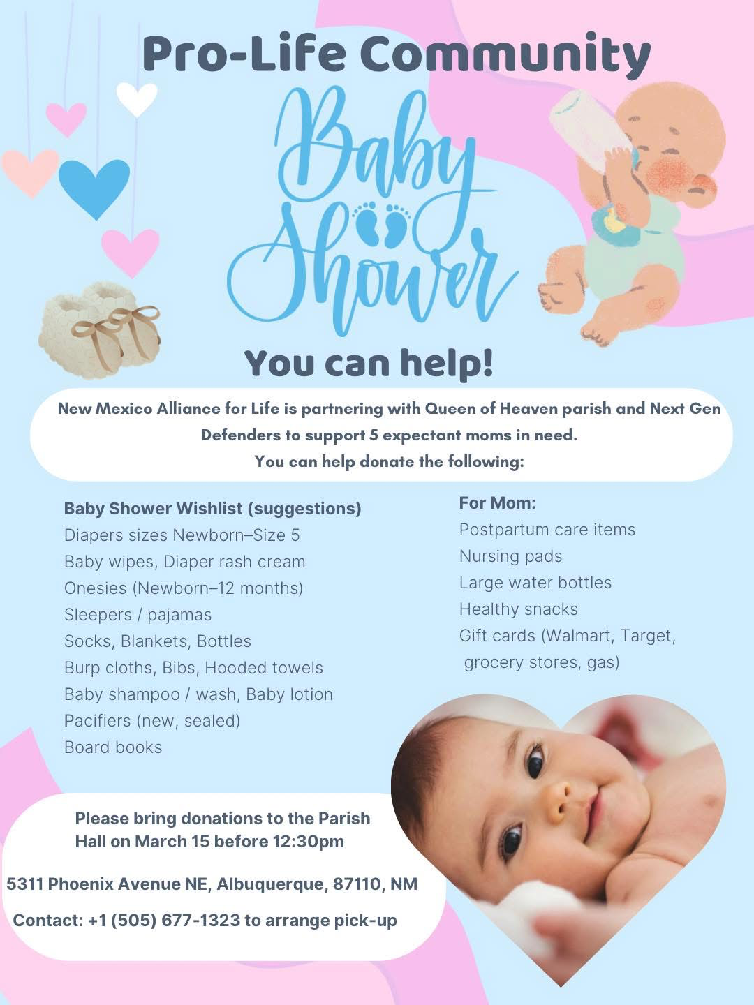 Shop the Amazon baby registry here or drop off donations at Queen of Heaven Parish Hall on March 15, 2026, before 12:30 PM, address: 5311 Phoenix Ave NE, 87110. For pickup or questions, contact 505-677-1323. Thank you for your generosity!