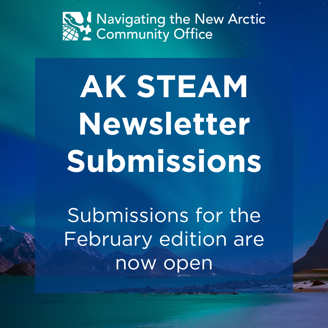 Help the NNA-CO share Alaska and Arctic-focused opportunities and resources with K-12 educators in science, technology, engineering, arts and math! The AK STEAM Newsletter is published quarterly and the next edition will be released in February. You can submit opportunities and resources to be shared here.