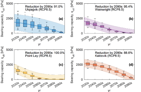 Top figure: Changes in bearing capacity in four coastal communities in northern Alaska by the 2090s. a, Projected bearing capacity in Utqiaġvik. b, Projected bearing capacity in Wainwright. c, Projected bearing capacity in Point Lay. d, Projected bearing capacity in Kaktovik. Bearing capacity is calculated under RCP8.5 climate forcing. Box plots show the median (center line), interquartile range (25th to 75th percentile, box), and whiskers extending to 1.5 times the interquartile range.