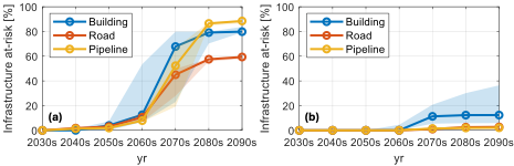 Bottom figure: Civil infrastructure at risk due to permafrost degradation on Alaska’s Arctic Coastal Plain over the 21st century. a, Infrastructure risk assessed under RCP8.5. b, Infrastructure risk assessed under RCP4.5.