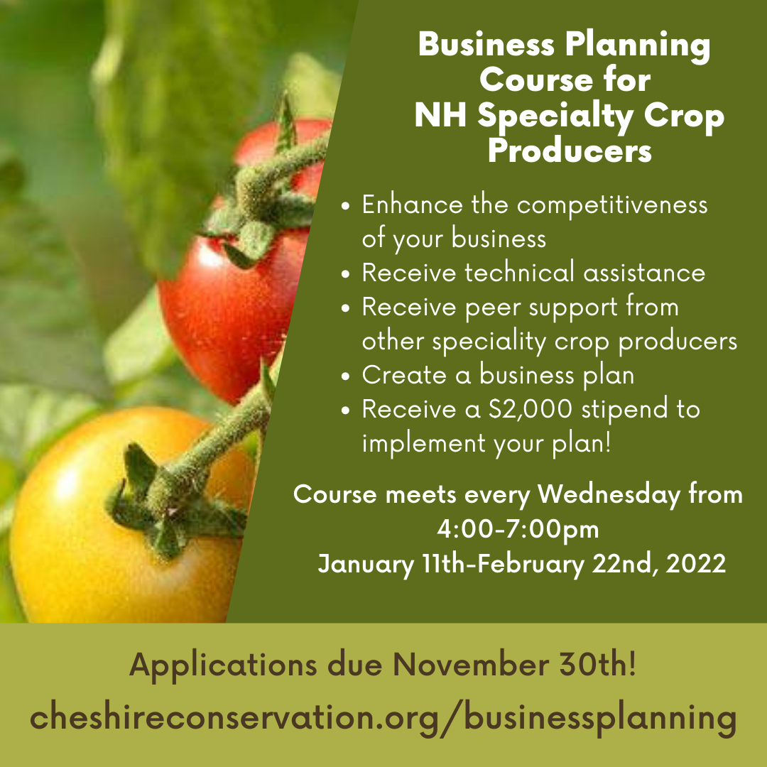 The Cheshire County Conservation District, the Hannah Grimes Center for Entrepreneurship, and National Center for Appropriate Technology (NCAT) are partnering to host a free 7-week-long business planning course (waived fee of $600!) for specialty crop producers in New Hampshire. Specialty crops are defined in law as, “fruits and vegetables, tree nuts, dried fruits and horticulture and nursery crops, including floriculture."