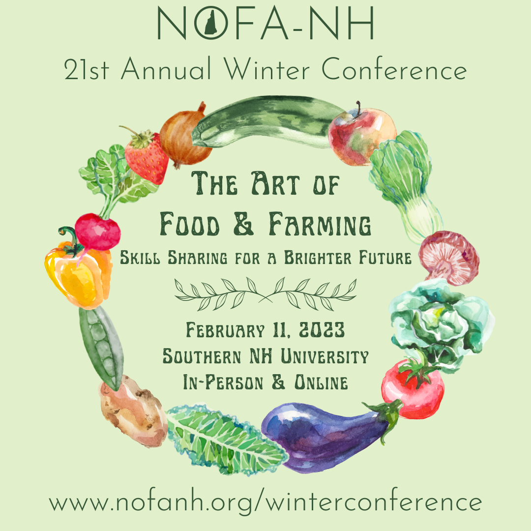 We are excited to announce that registration for NOFA-NH’s 21st Annual Winter Conference is open! This year’s conference theme is The Art of Food & Farming: Skill Sharing for a Brighter Future and we hope you will join us to hone our skills with over 25 in-person workshops and panels focused on sharing expertise, filling our toolkits, and building community resilience! An online track will be available for those unable to attend in person. NOFA/MOFGA Members save 20% on registration!