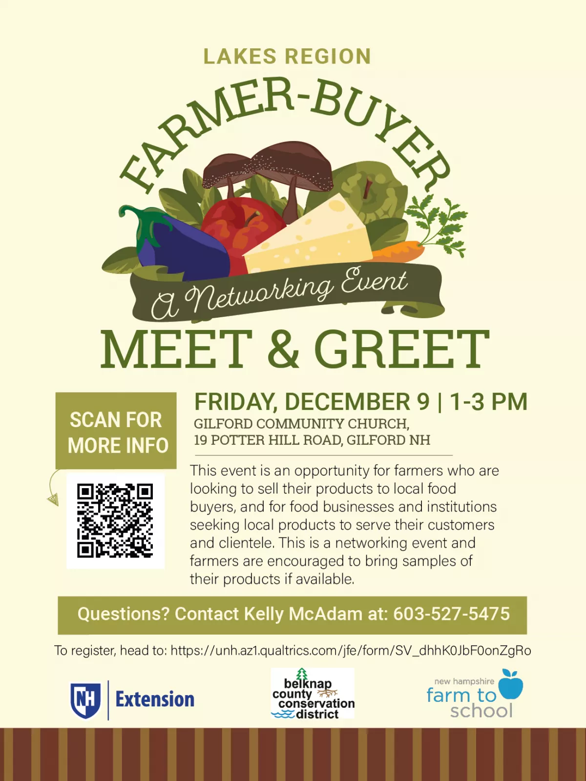 This event slated for Friday, December 9th from 1:00 PM - 3:00 PM at the Gilford Community Center is an opportunity for farmers who are looking to sell their products to meet local food buyers, and for food businesses seeking local products to serve their customers and clientele. This is a networking event and farmers are encouraged to bring samples of their products if available.