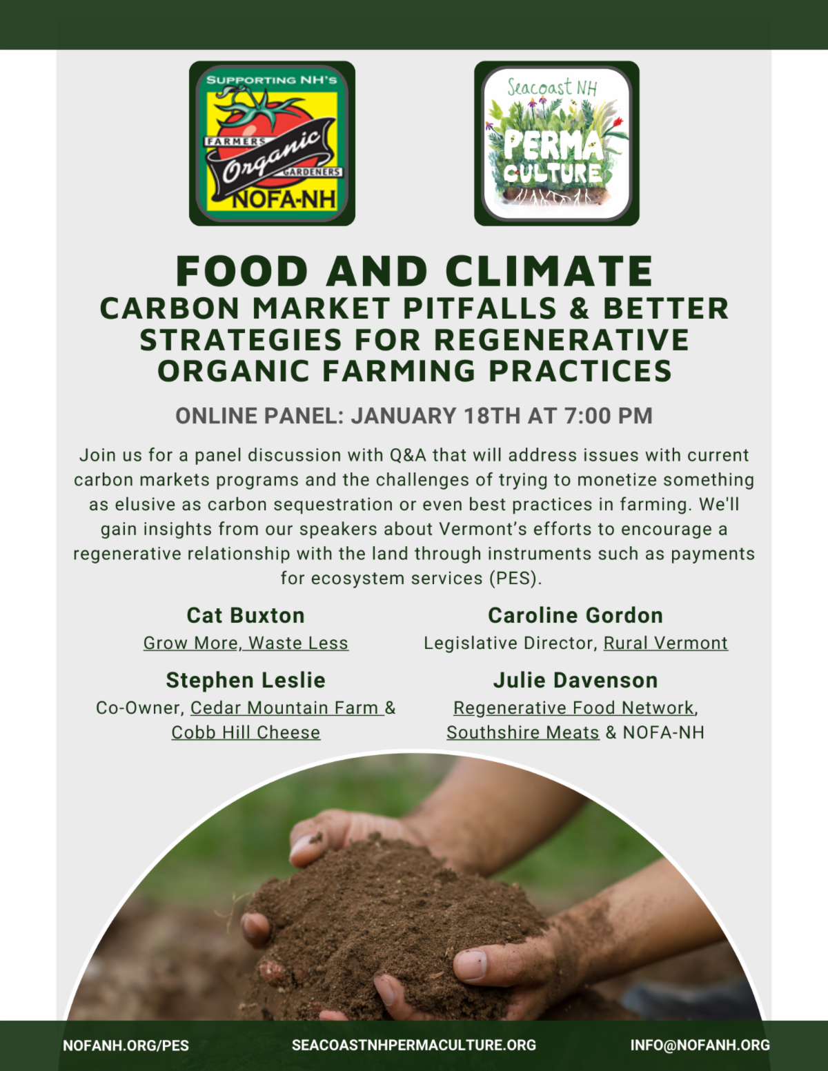Please save the date for an exciting online panel NOFA-NH is presenting in collaboration with Seacoast NH Permaculture. Join us on January 18, 2023 at 7 PM for an online panel discussion: Food and Climate: Carbon Market Pitfalls & Better Strategies for Regenerative Farming Practices. Panel speakers include Cat Buxton of Grow More, Waste Less, Caroline Gordon of Rural Vermont, Stephen Leslie of Cedar Mountain Farm & Cobb Hill Cheese, and Julie Davenson of the Regenerative Food Network, Southshire Meats, & NOFA-NH.
