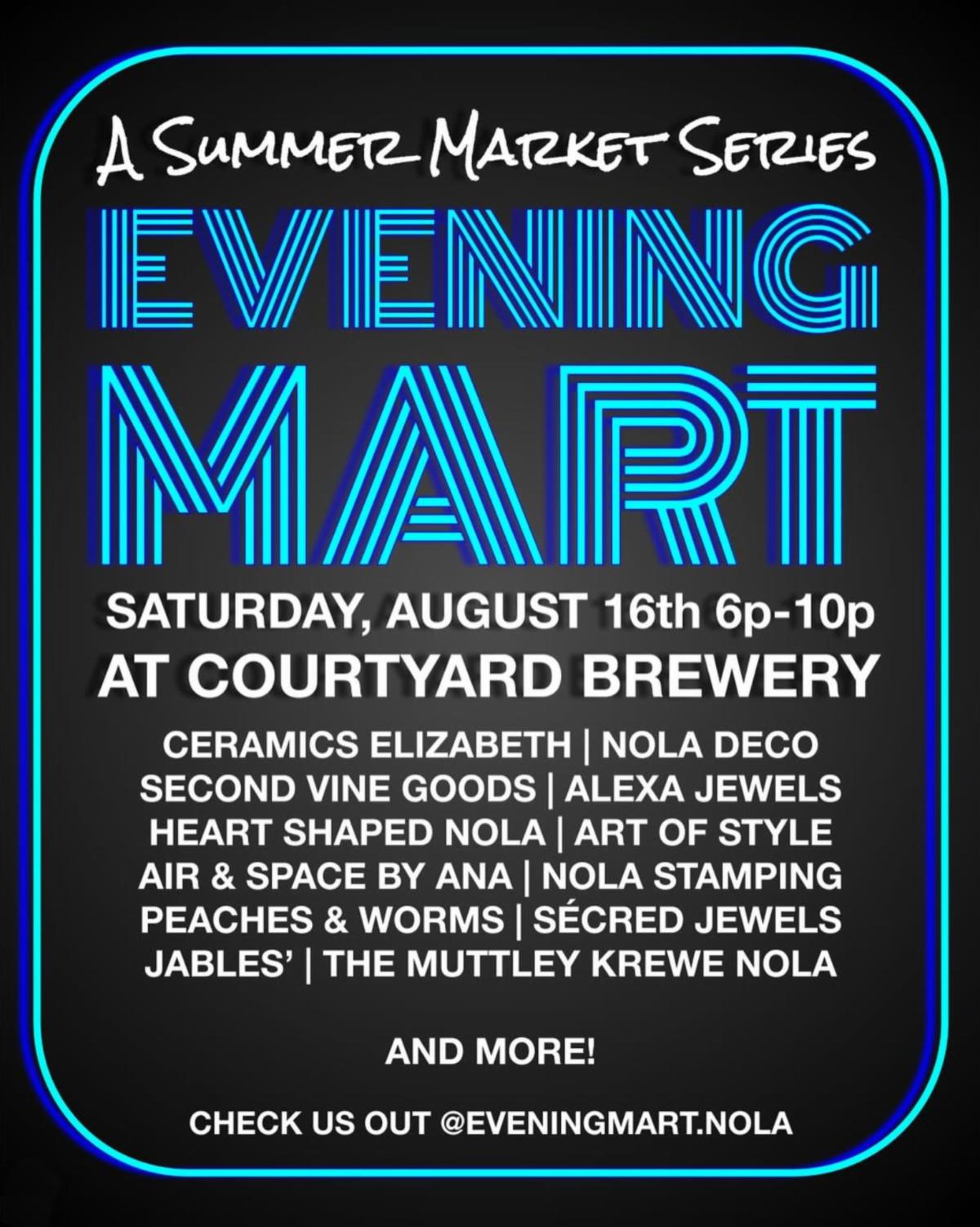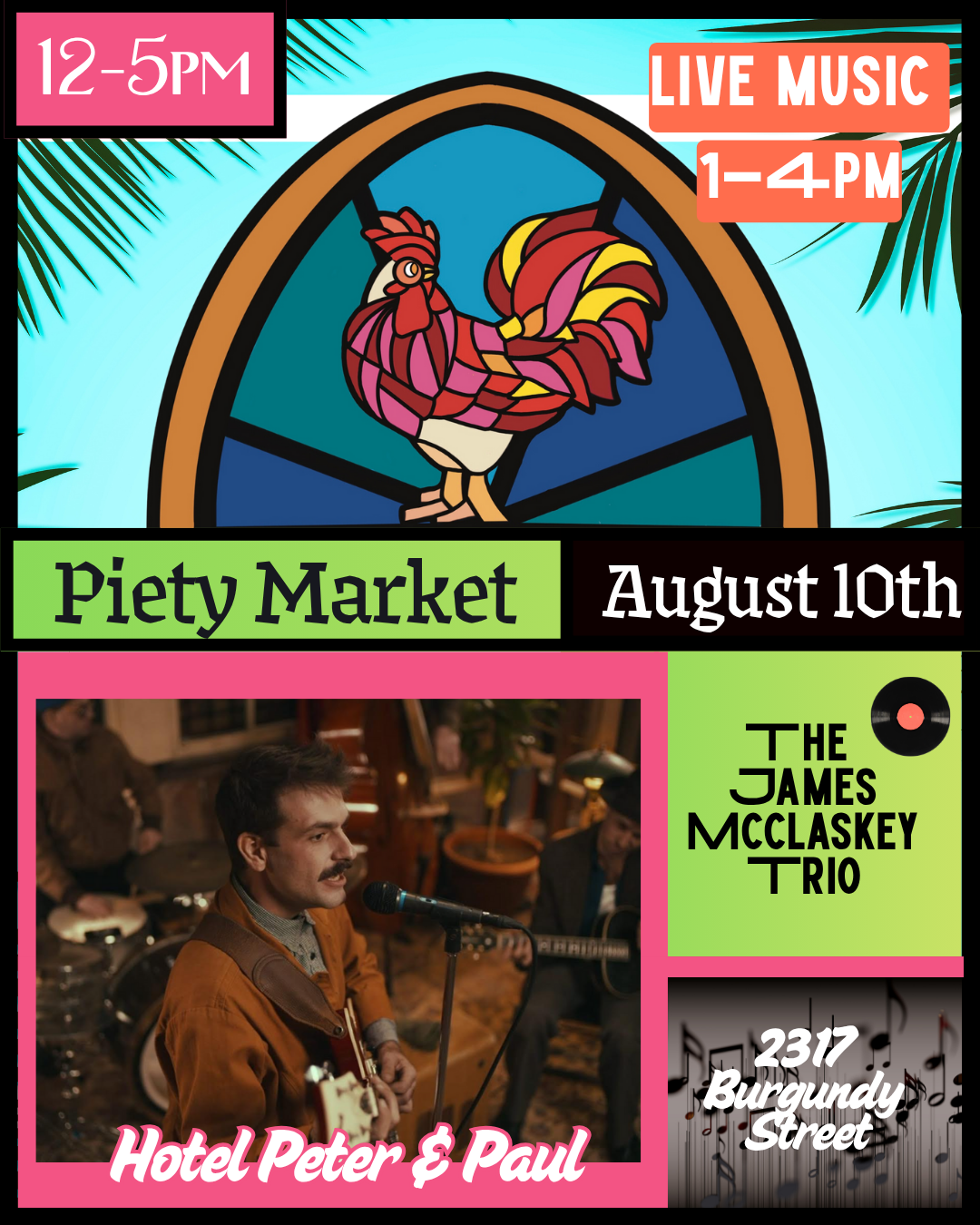 ⭐ NOLA DECO at Piety Market at Hotel Peter & Paul, 12 p.m. to 5 p.m. This is always a pleasant way to spend a Sunday afternoon, especially in the summer heat. A dozen vendors (including yours truly) selling a wide variety of crafts, small batch body & beauty products, art, vintage, clothing, some light food options, and a live performance, all in an elegant "deconsecrated red brick Catholic church, the former Sts. Peter and Paul, designed by New Orleans architect Henry Howard."