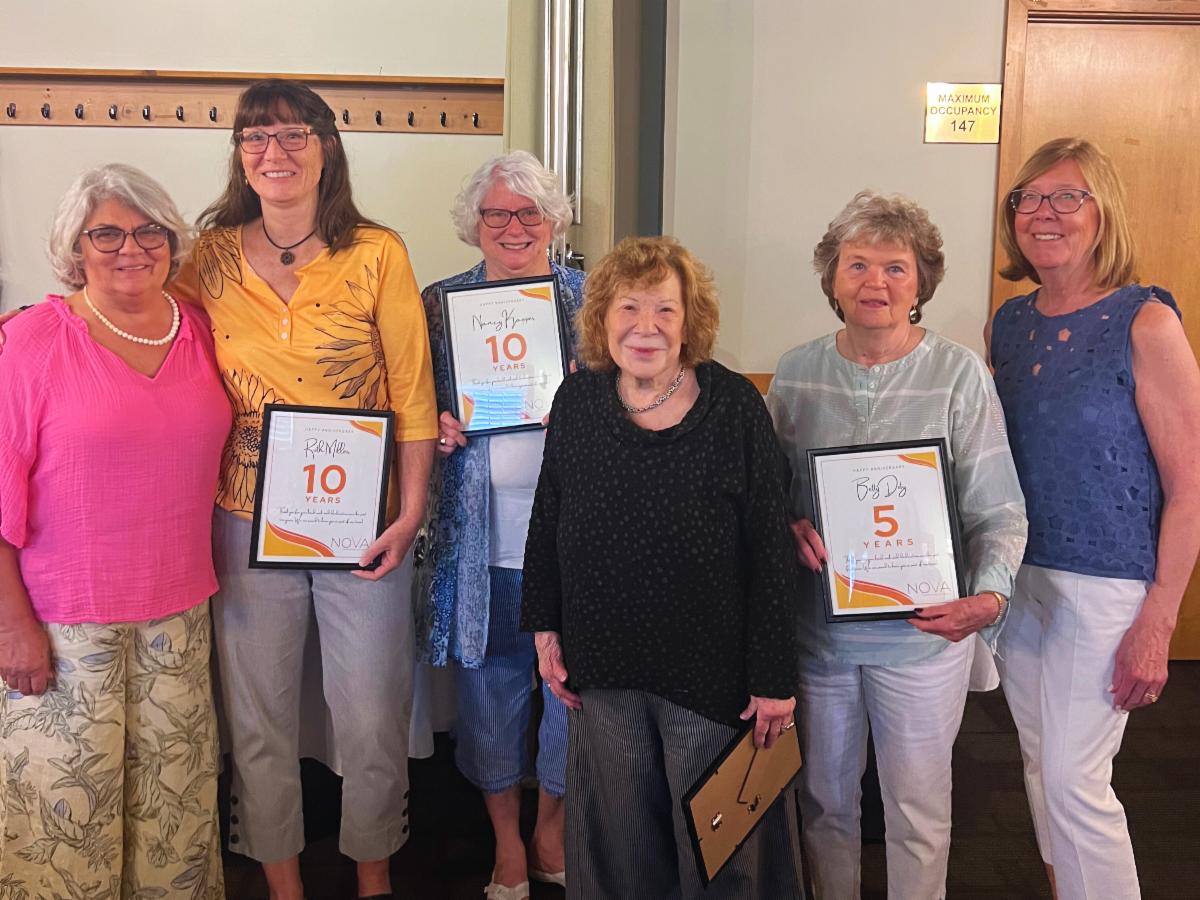 | | Pictured (L to R) are Maria White, NOVA Thrift Shop Manager; NOVA volunteers Ruth Miller (10 years), Nancy Kapper (10 years), Maryann Edwards (10 years), and Betty Doty (5 years); and Julie Dugery, Coordinator of Volunteers and Community Engagement, NOVA. Not pictured are Barbara Hampel (10 years) and Ann Marie Masgai (5 years). | | We appreciate your dedication to serving victims of crime, and we are proud to have had you as part of the NOVA Team! | |