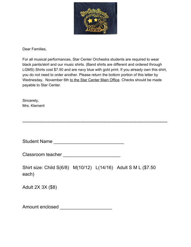 Students need to order a music shirt which will be worn for orchestra as well as accent choir concerts. The shirts are $7.50 unless you're getting a larger size, which is specified on the attached sheet. Students in 4th grade received this today and 5th graders will get it on Friday.Please turn it into the Star Center Main Office by Wednesday, November 6. I will not be collecting any money