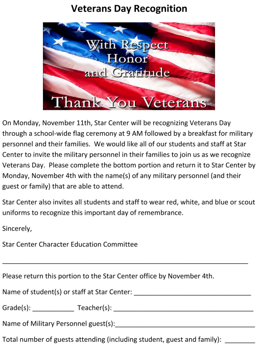 - Veteran's Day Assembly and Breakfast, 9:00am