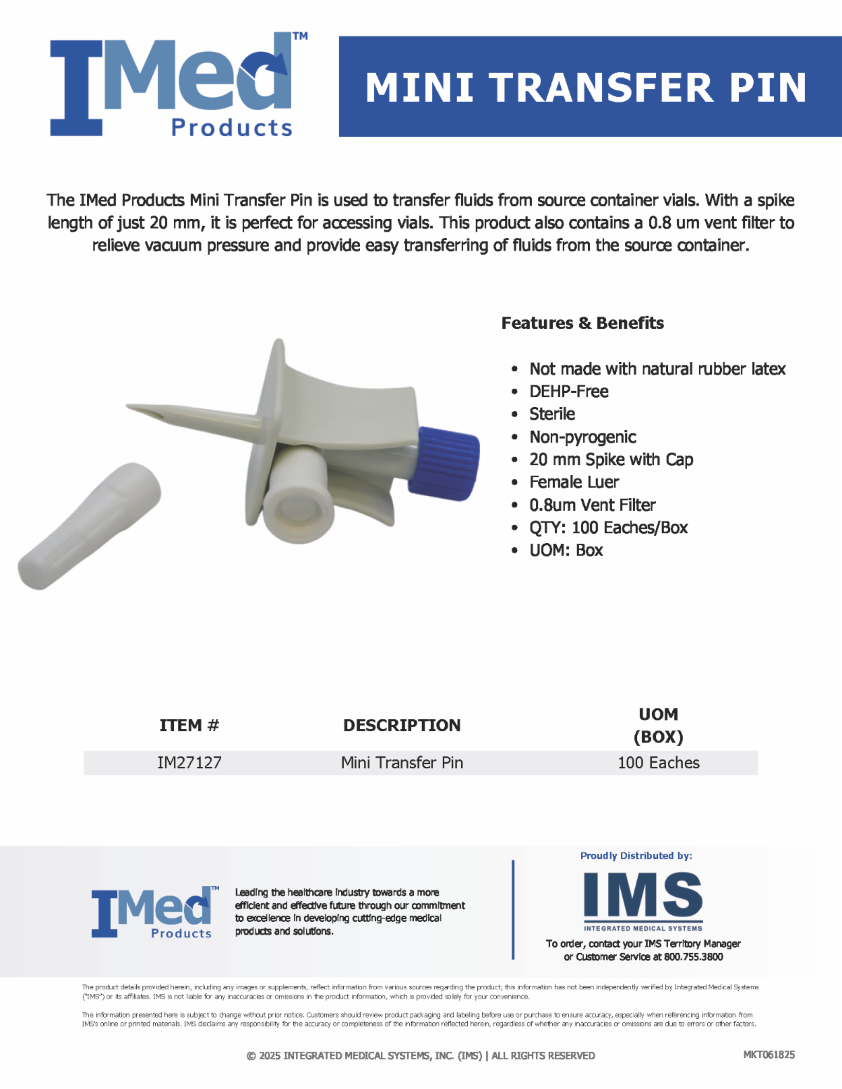 As you may have seen, the new IMed Products™ Mini Transfer Pin (Item #IM27127) has launched! This is a perfect opportunity to open new conversations with customers who handle compounding, fluid transfers, or vial-based workflows.