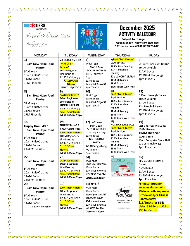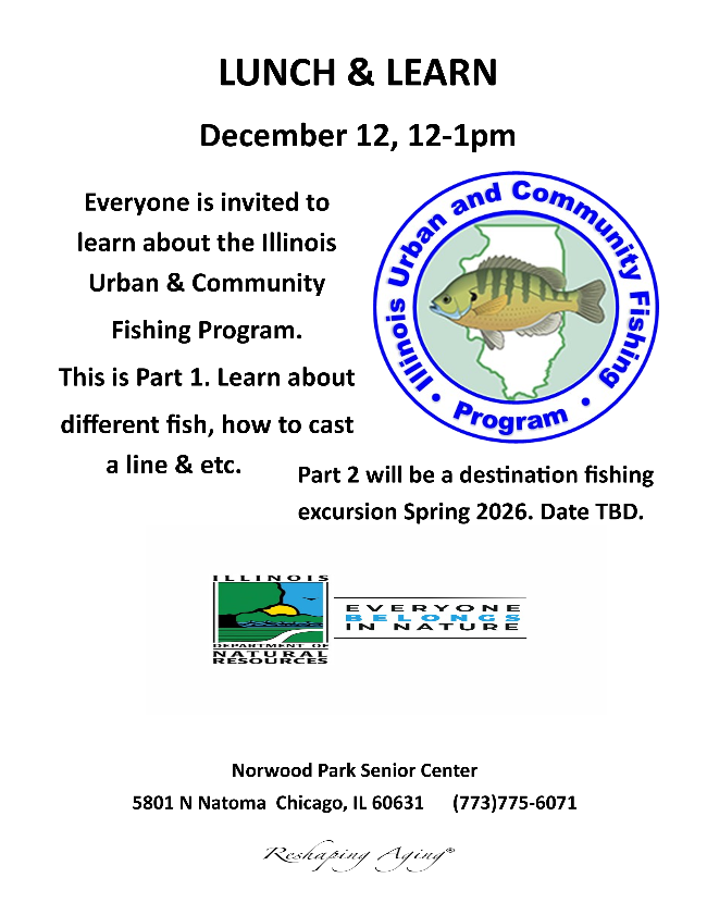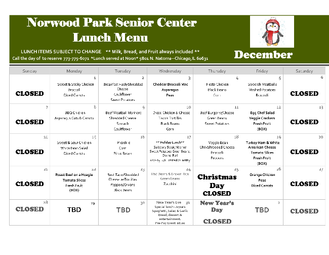 Attached is our December Activity calendar & menu as well as flyers of some upcoming events. We have three Lunch & Learns planned for this month. The first is a discussion on the importance of Life Alert systems on Thursday, 12/4. The next on Tuesday, 12/9, we welcome the Cook County Assessors office to come speak about exemptions & certificates of error and the third will be Friday 12/12 with the Illinois Department of Natural Resources.